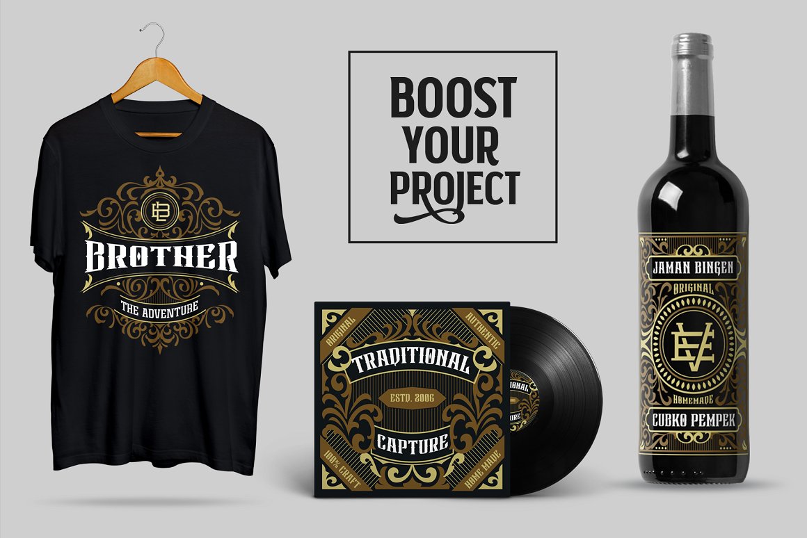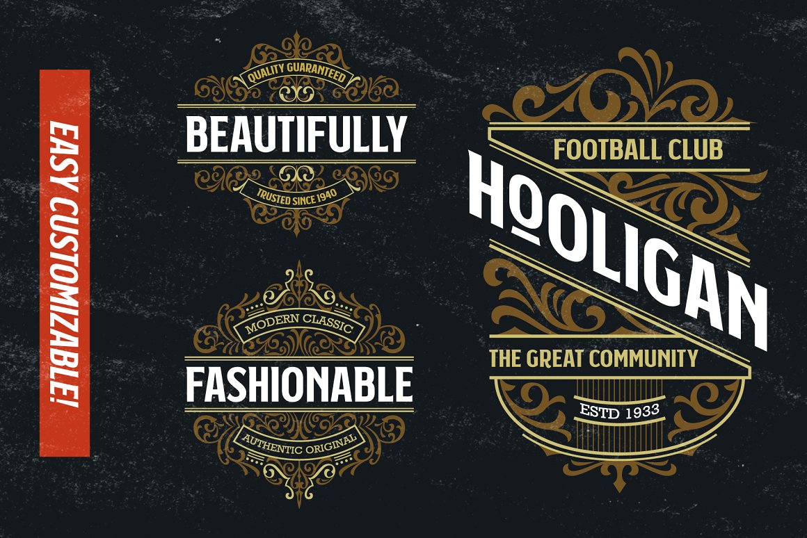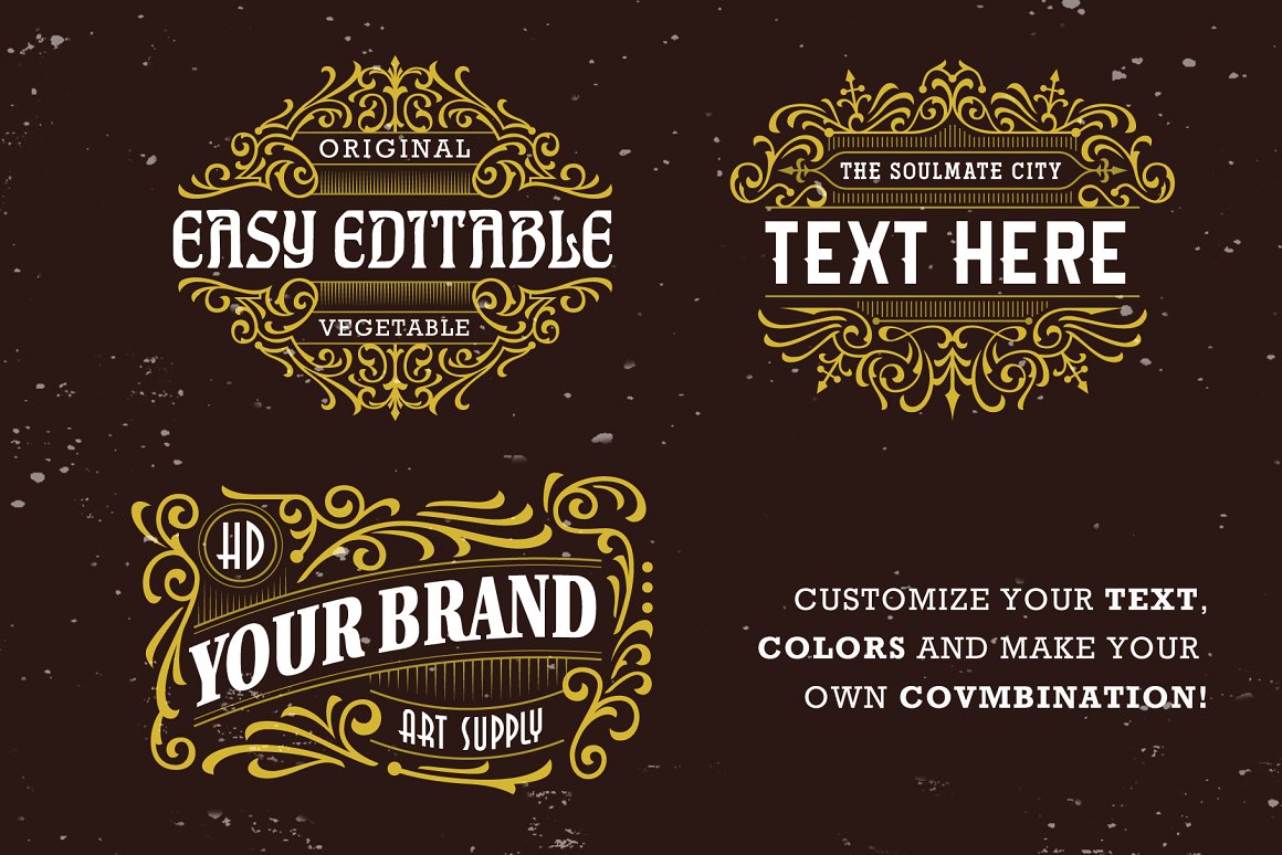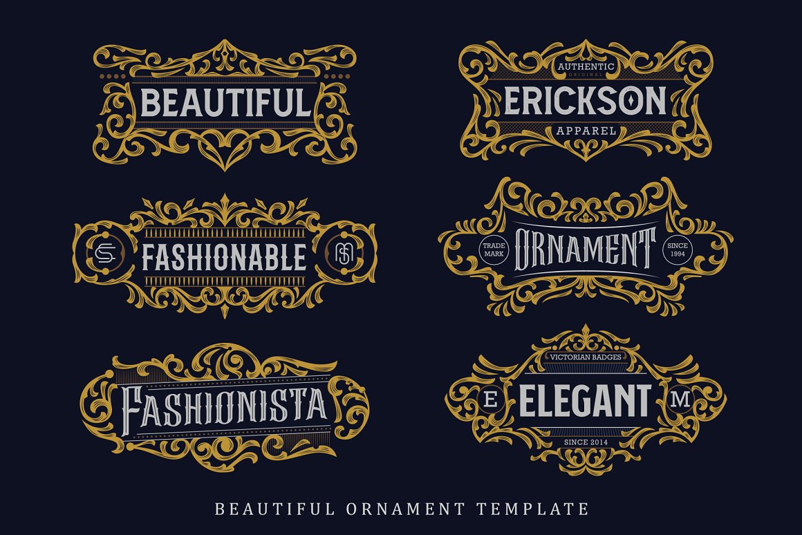 Introducing Victorian Ornaments Vector ; Label, badges & frames. The set of ornamental object that inspired from art nouveau and victorian style. Carefully crafted in medium details that gives traditional-modern looks. This set included 20 ornament design that very recommended for your vintage label design, logo badges, frame for photo, store front, banner, logotype, clothing design, event poster. In vector format, you can simply edit, recolor the artwork, customize the text and make your own design!