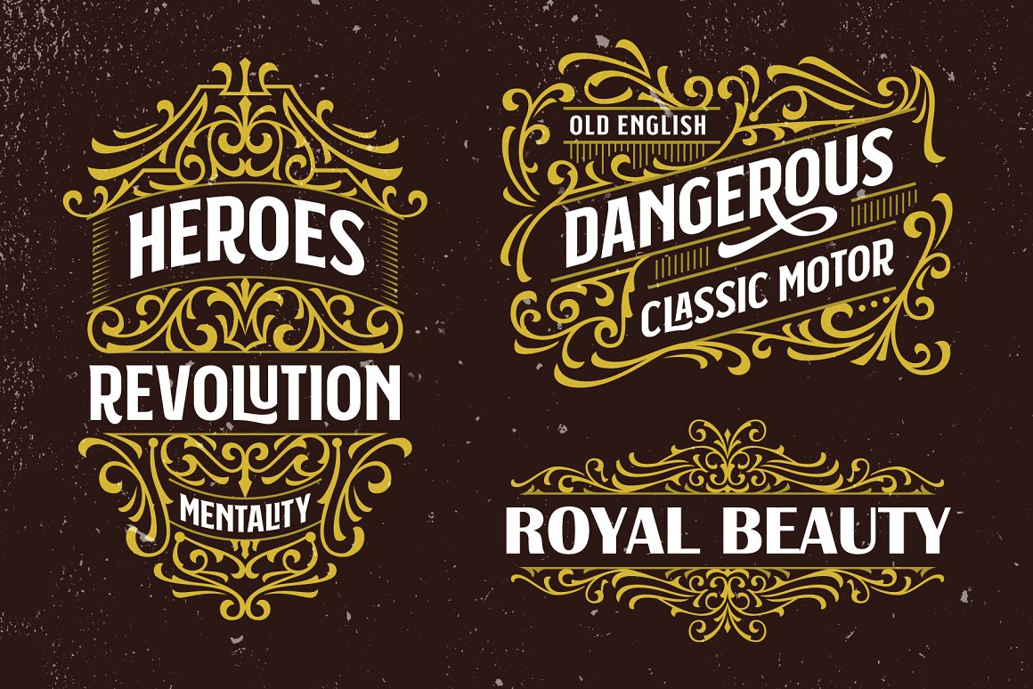 11 vintage style vector graphic sets with frames & badges + 1 font family!