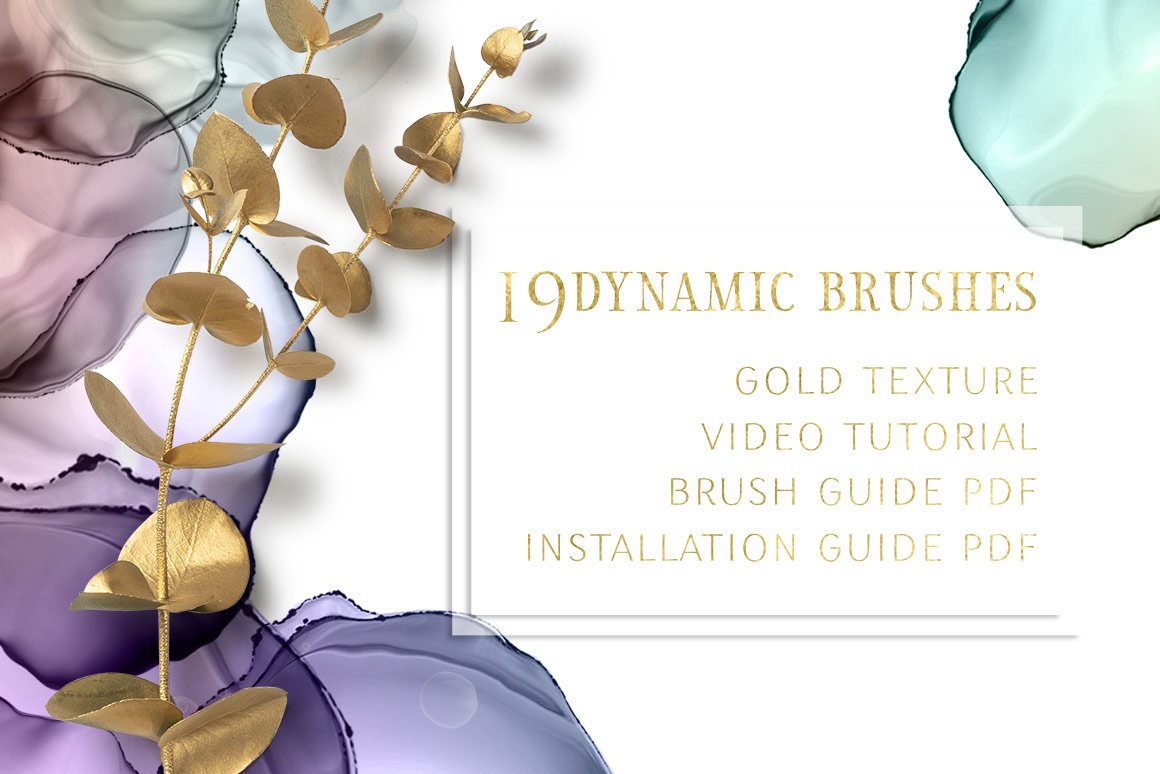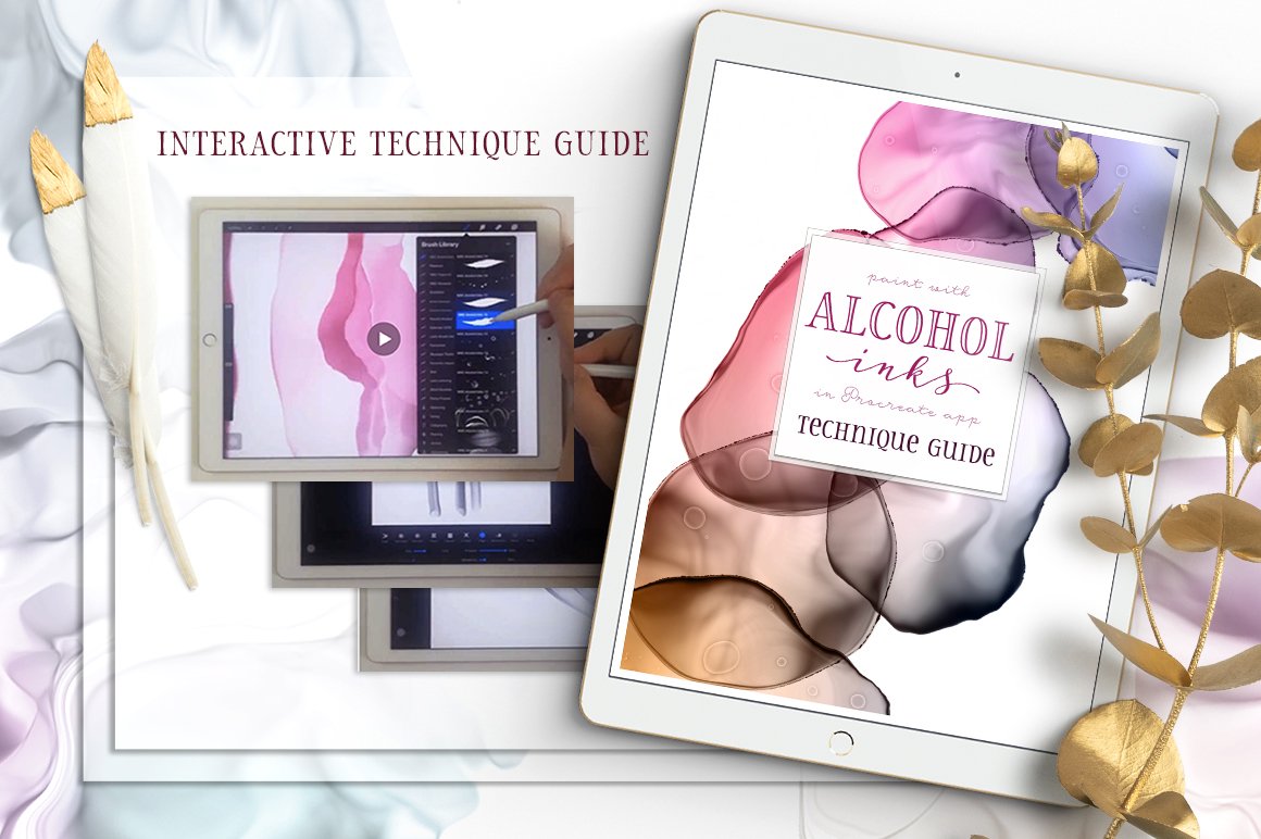 To speed up your creative process we have made a reference Brush Guide PDF and an interactive epub with short videos showing the techniques we used to achieve the look of Alcohol Inks digitally. You can open and watch the epub in the Book app on the iPad. Check the YouTube video for additional demonstration.