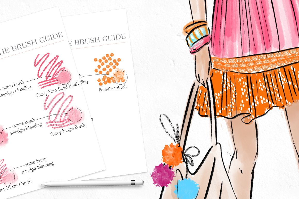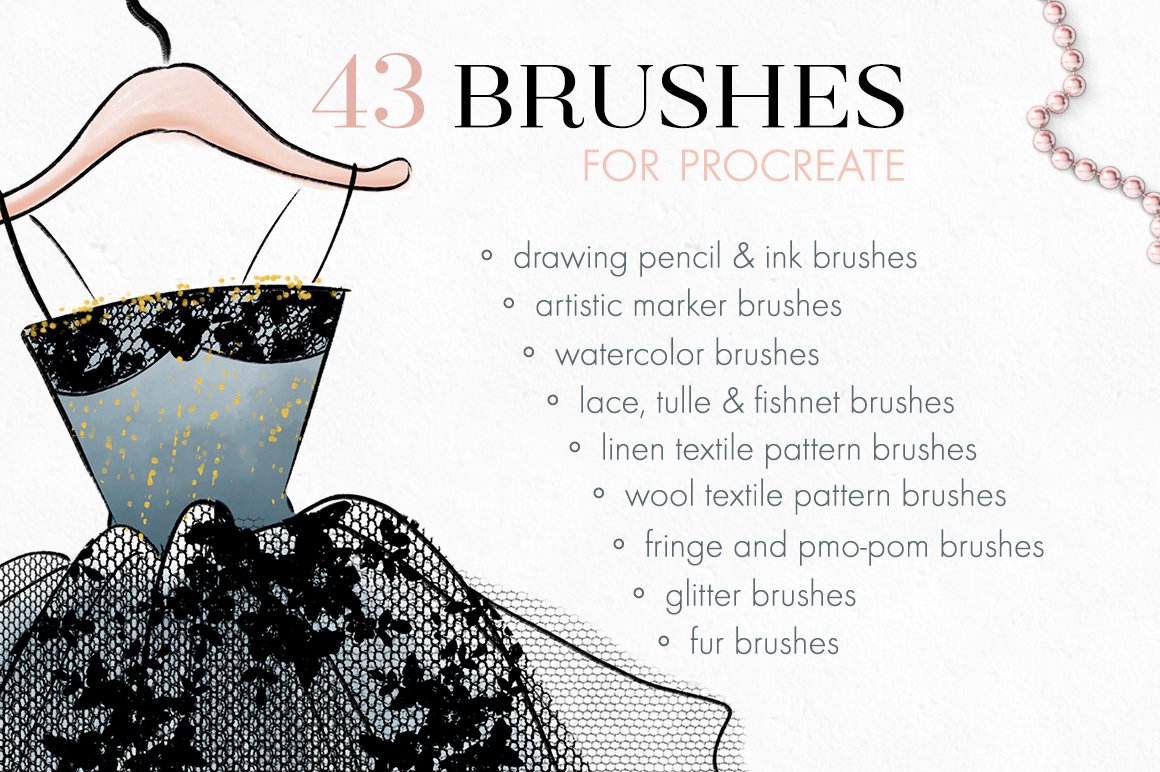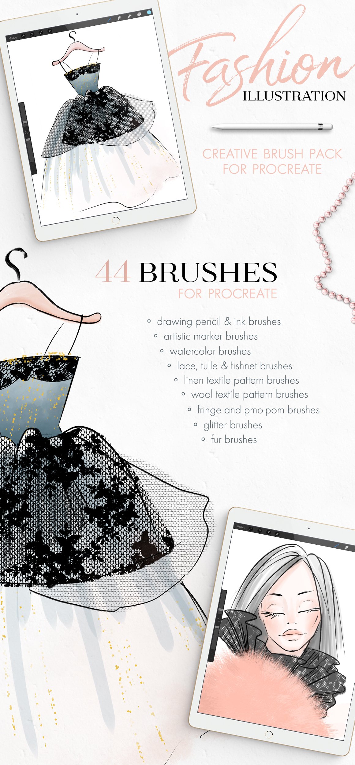 This set includes basic sketching and drawing tools like pencil and ink brush; artistic alcohol markers and watercolor brushes for painting and some very very special brushes that are going to make your designs really stand out. Tulle fabrics, lace fabrics, knit and woven fabrics are just a few of the brushes that will take your illustration process to a whole new level. They save loads of time and give impressive instant results!