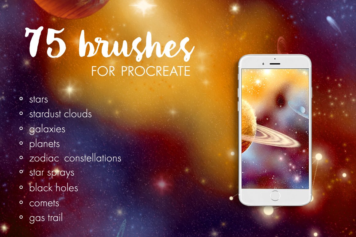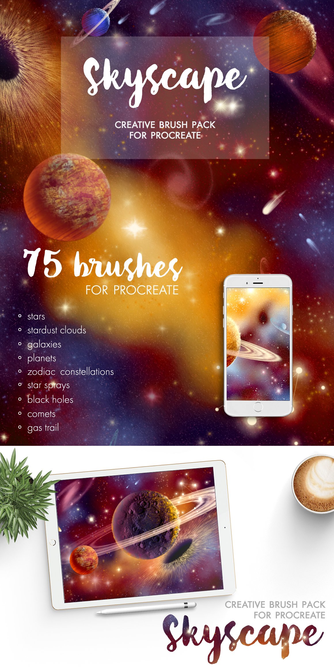 This set includes cloudy brushes for painting nebulae or just atmosphere clouds, stars, sprays, planets and moons, black holes, galaxies and all 12 zodiac constellations each in 3 variations. Check the image previews for all the brush samples.