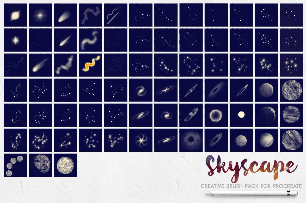 Skyscape – brush toolkit for Procreate app with 75 brushes and 2 canvas templates with textures.