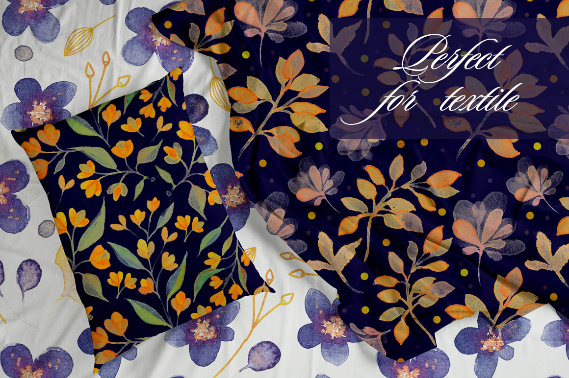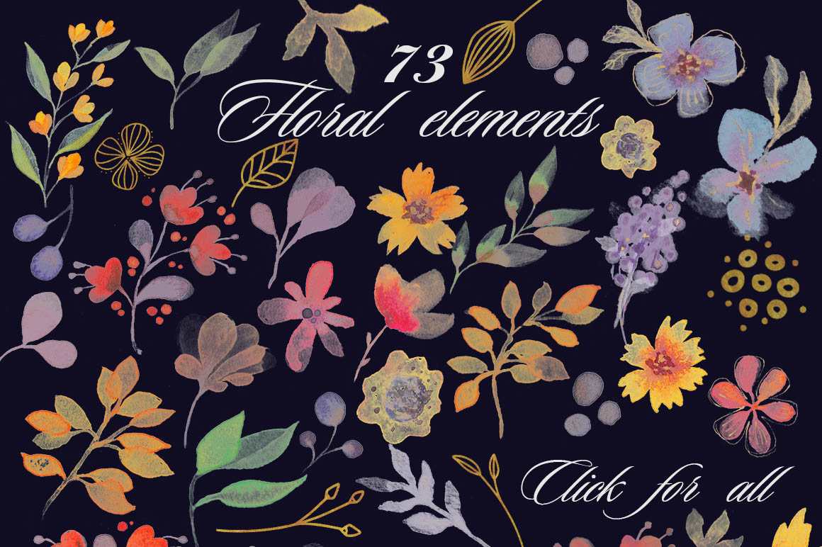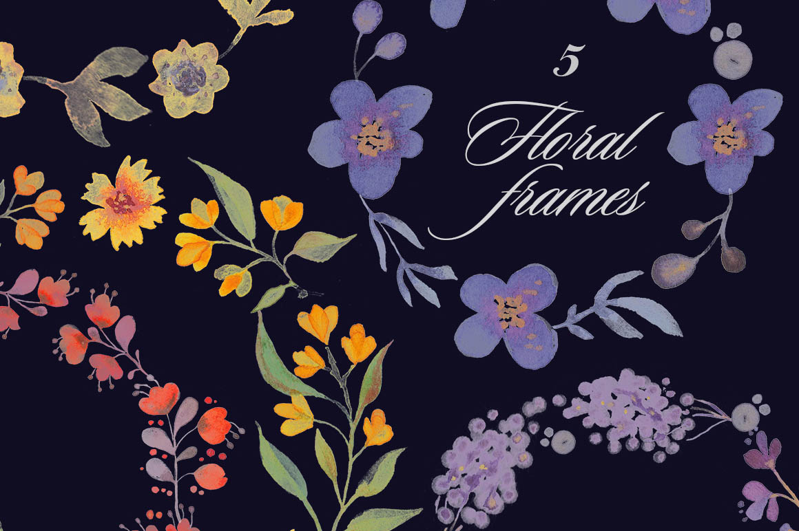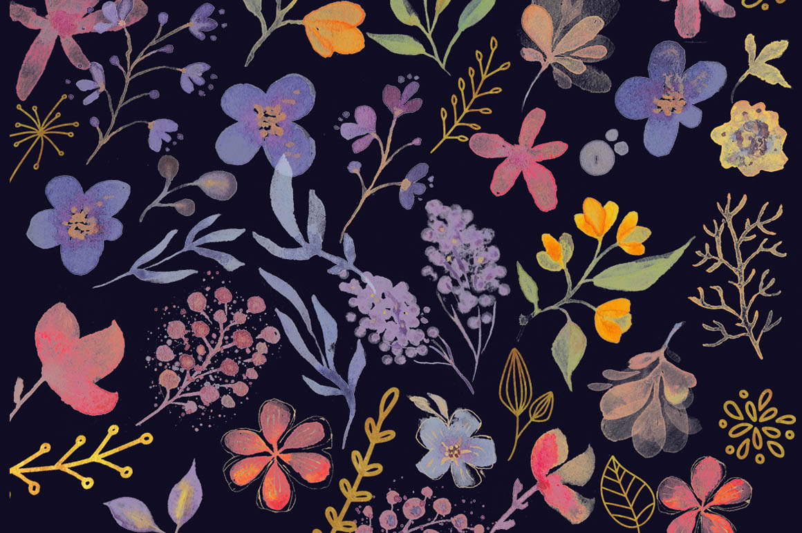 ‘By night’ is a big collection of floral and abstract watercolors, seamless patterns and frames, which were drawn by hand & then carefully digitized.