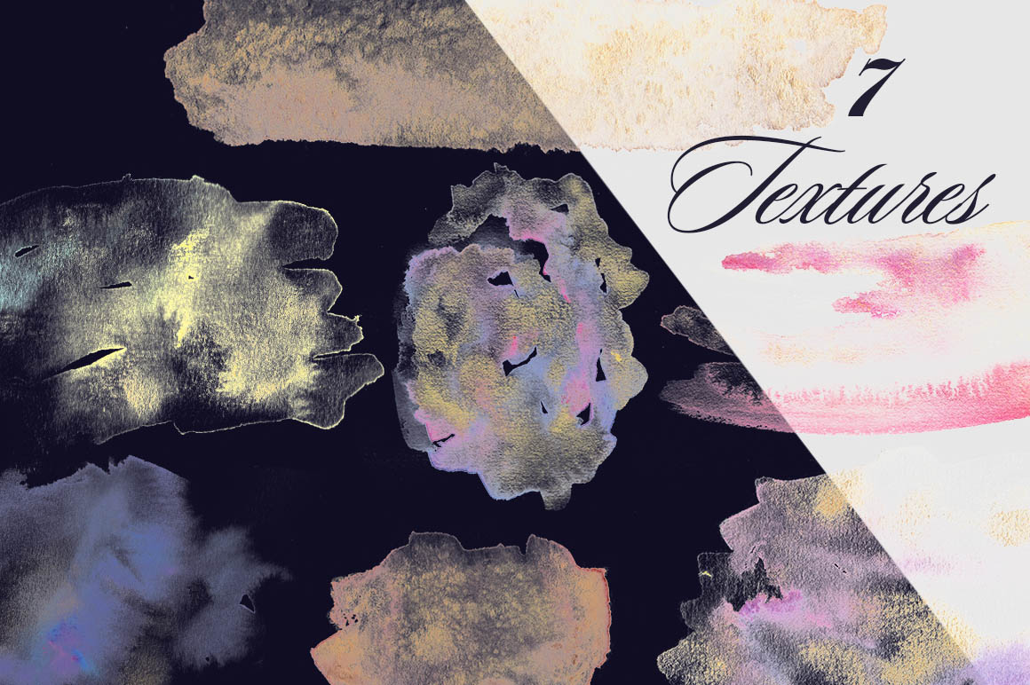 - 7 watercolor textures (separately on 7 files JPG, 7 files PNG on transparent background);
