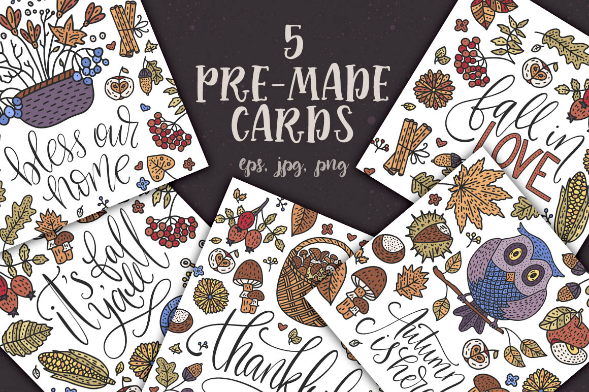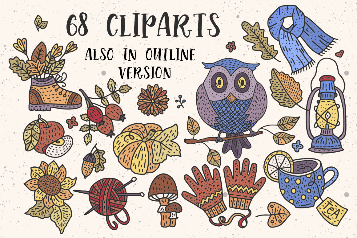 ‘COZY FALL’ is a big collection with detailed autumn cliparts, lettering messages, seamless patterns and pre-made cards.