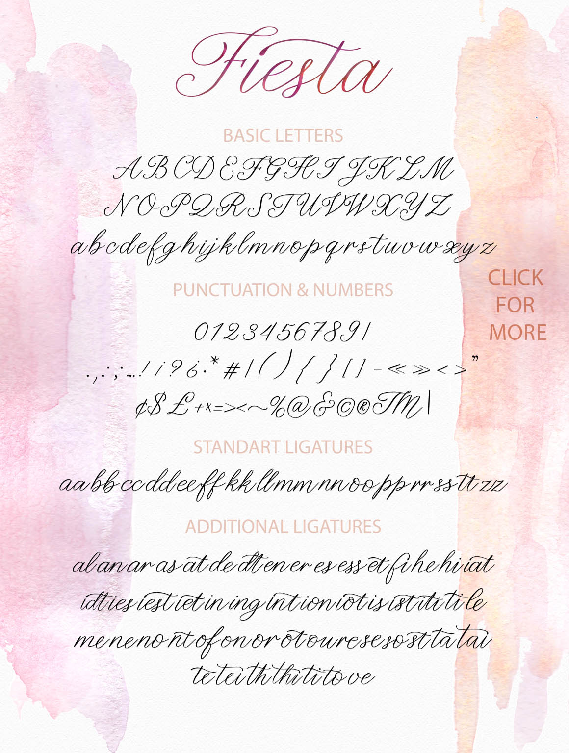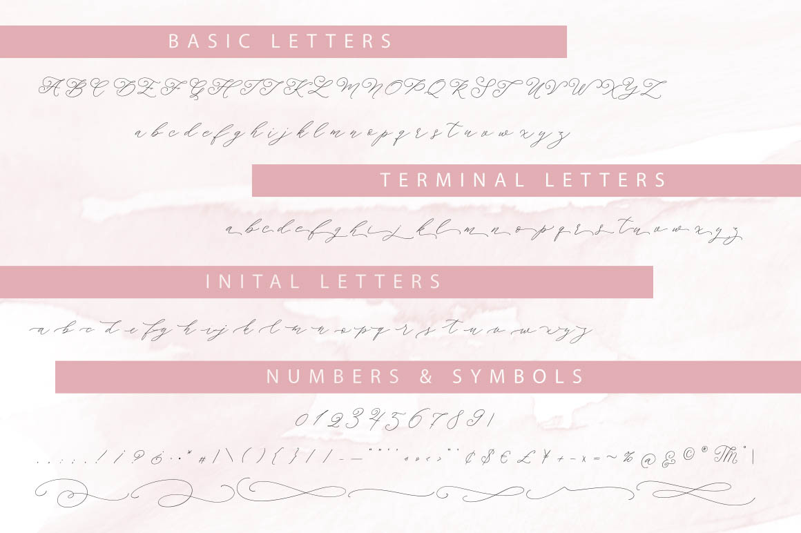 3 variants of alternate letters for the uppercase and 6 variants of alternate letters for the lowercase, make this font an unique tool for creating handdrawn texts, richly decorated with swashes.
