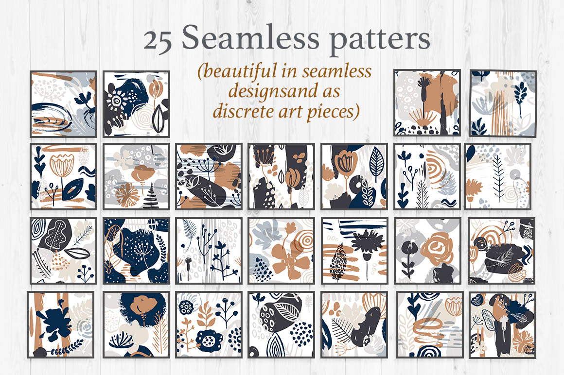 - 25 seamless patterns (separately on 25 files EPS10, 25 files JPG, 25 files PNG on transparent background);