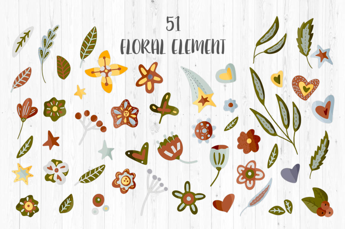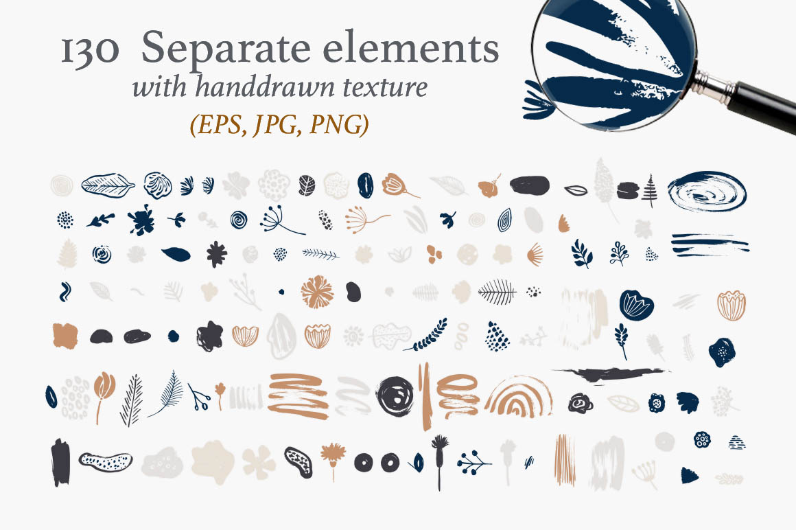 - 130 color elements (all in one EPS and separately files 130 files JPG, 130 files PNG on transparent background);