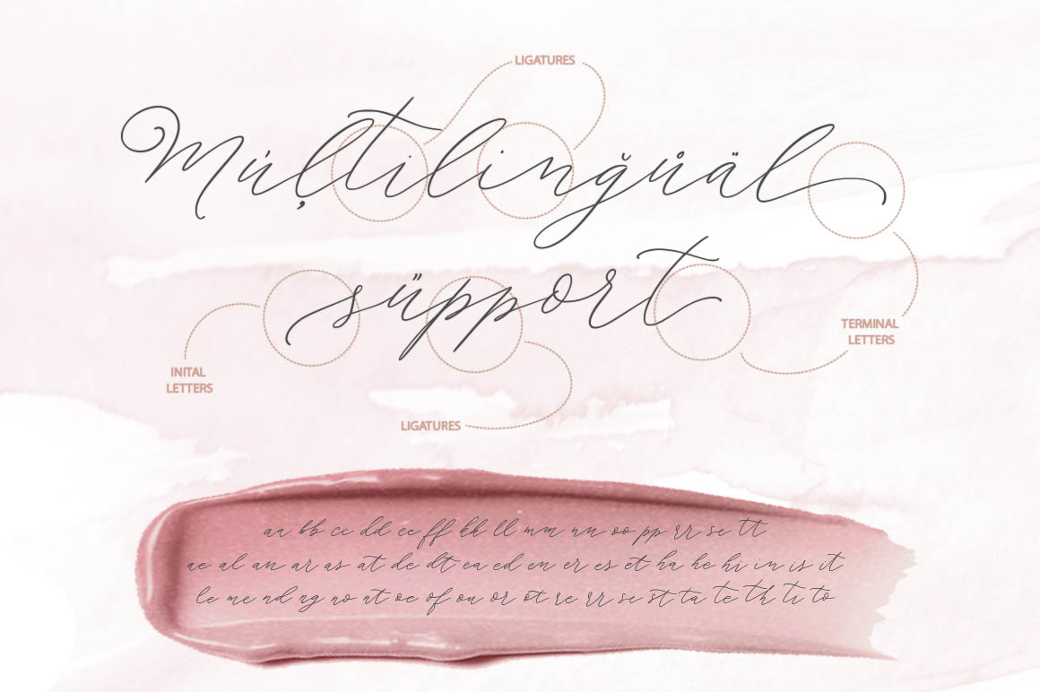 You can still use the Glyphs panel. You’ll see there 182 stylistic alternate glyphs and 15 ligatures. It has multilingual support, which include Western European, Central European and South Eastern European languages. Please type characters in text box below to check any characters you need.
