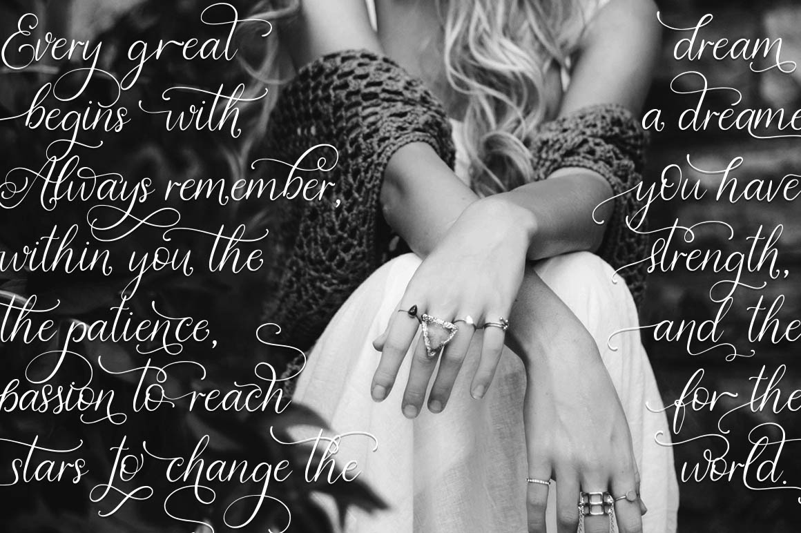 Nightingale is a beautiful script font with lots of OTF. 6 variants of alternate letters for the lowercase and set of alternate letters for uppercase, make this font an unique tool for creating amazing handdrawn texts, richly decorated with swashes.