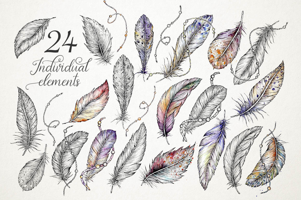 - 12 handdrawn watercolor clip art feathers (12 JPG files and 12 PNG files on a transparent background);