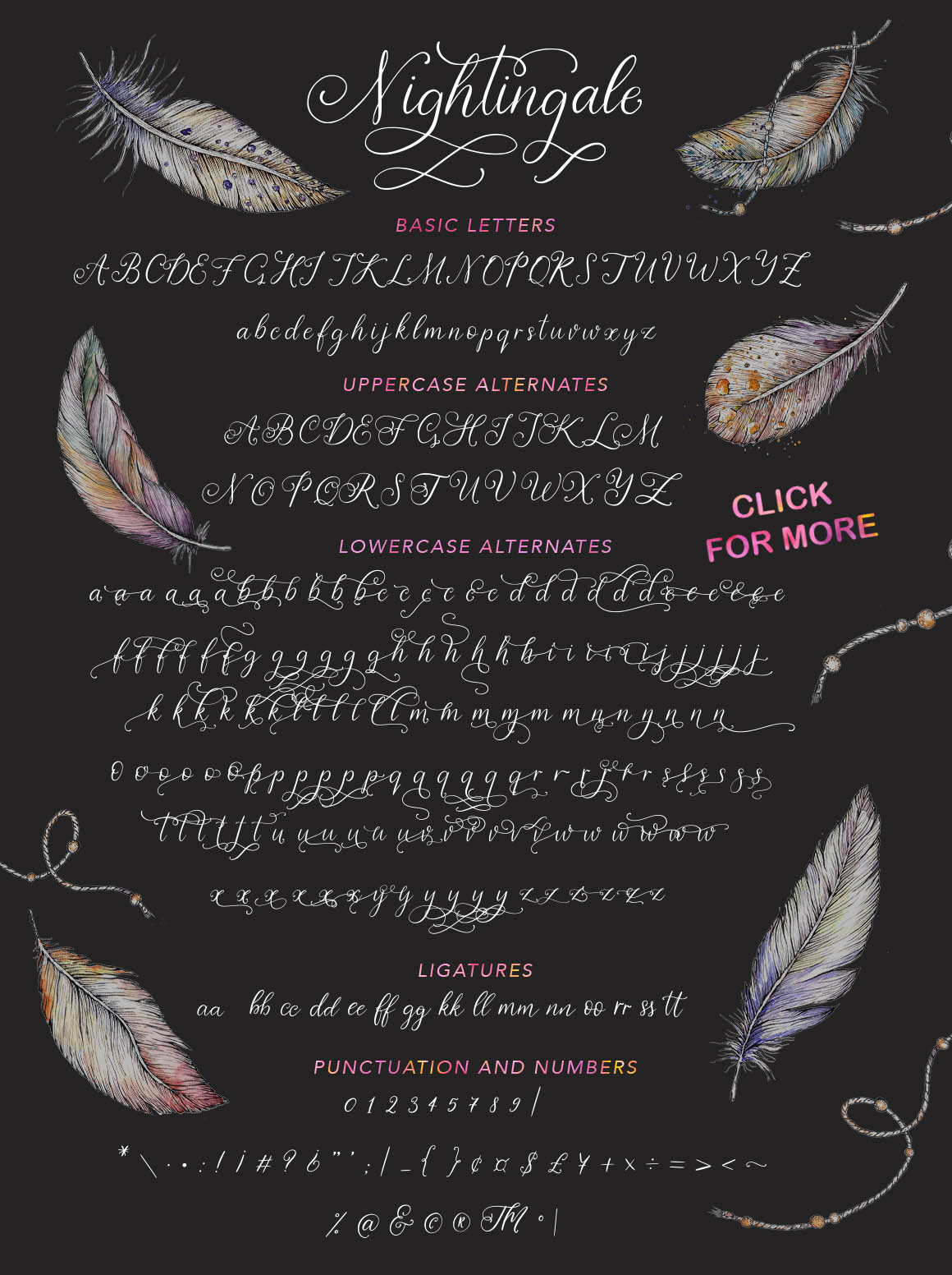 Nightingale Font come with PUA Unicode that gives you full access to the ligatures and alternates in software that doesn’t support the extra characters. To access these characters you can use Font Book (Mac) or Character Map (Windows).