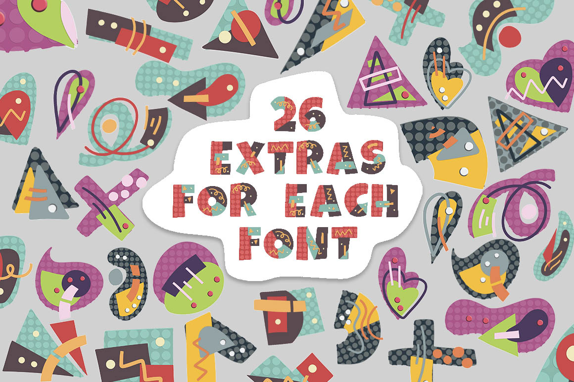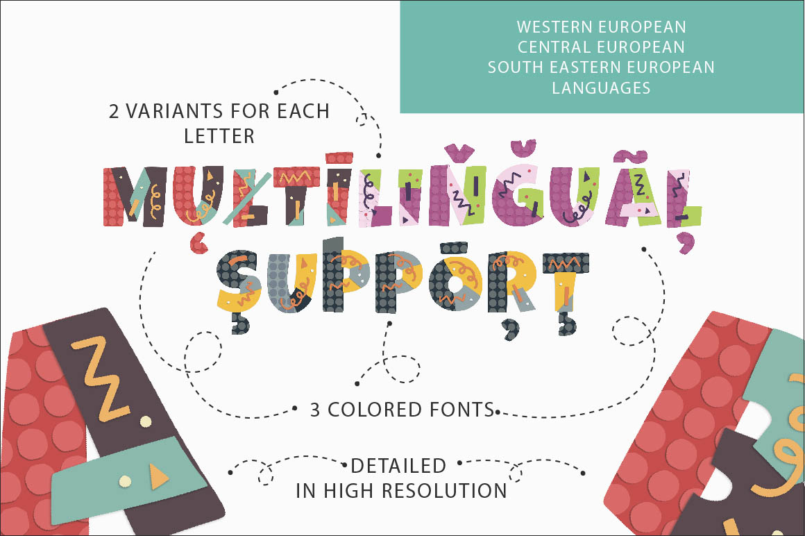 I created three SVG Fonts, with color handdrawn letters and symbols in high resolution. There is an impression, that different pieces of colored paper are collected in a color letter, like a puzzle and preserve some little shadows and the texture of the cutout elements.