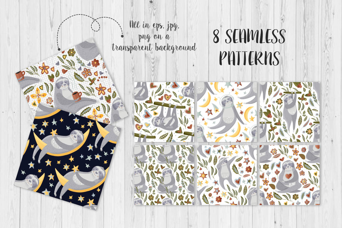 - 8 seamless patterns (separately on 8 files EPS10, 8 files JPG, 8 files PNG on transparent background);