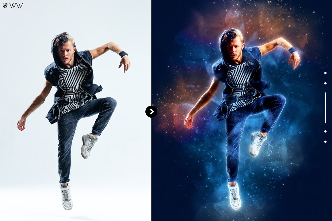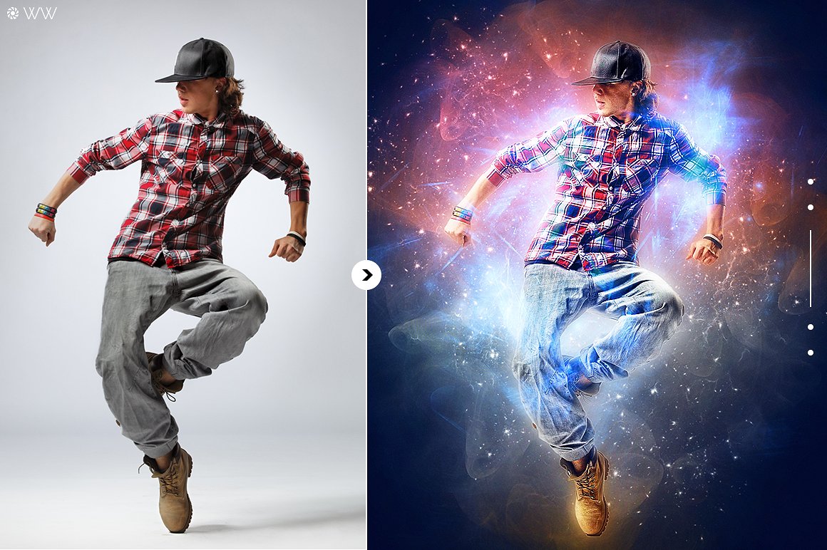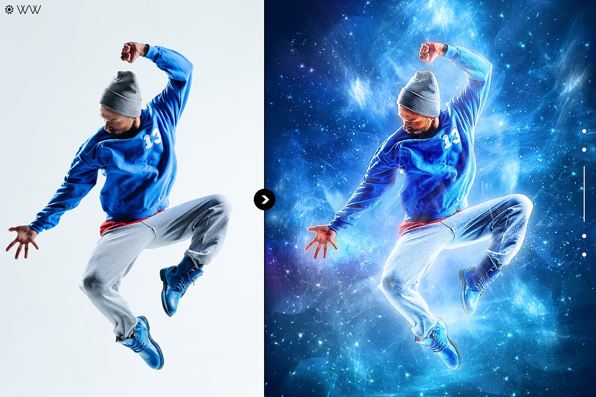 Space Photoshop Effect is a Photoshop action that will add professional cosmic effects to your photos. Create a Cosmic Effect the easy way! The action works on an area of the image you define by brushing. The result is multiple layers with advanced customization possibilities: blending modes, adjustment layers and layer masks.