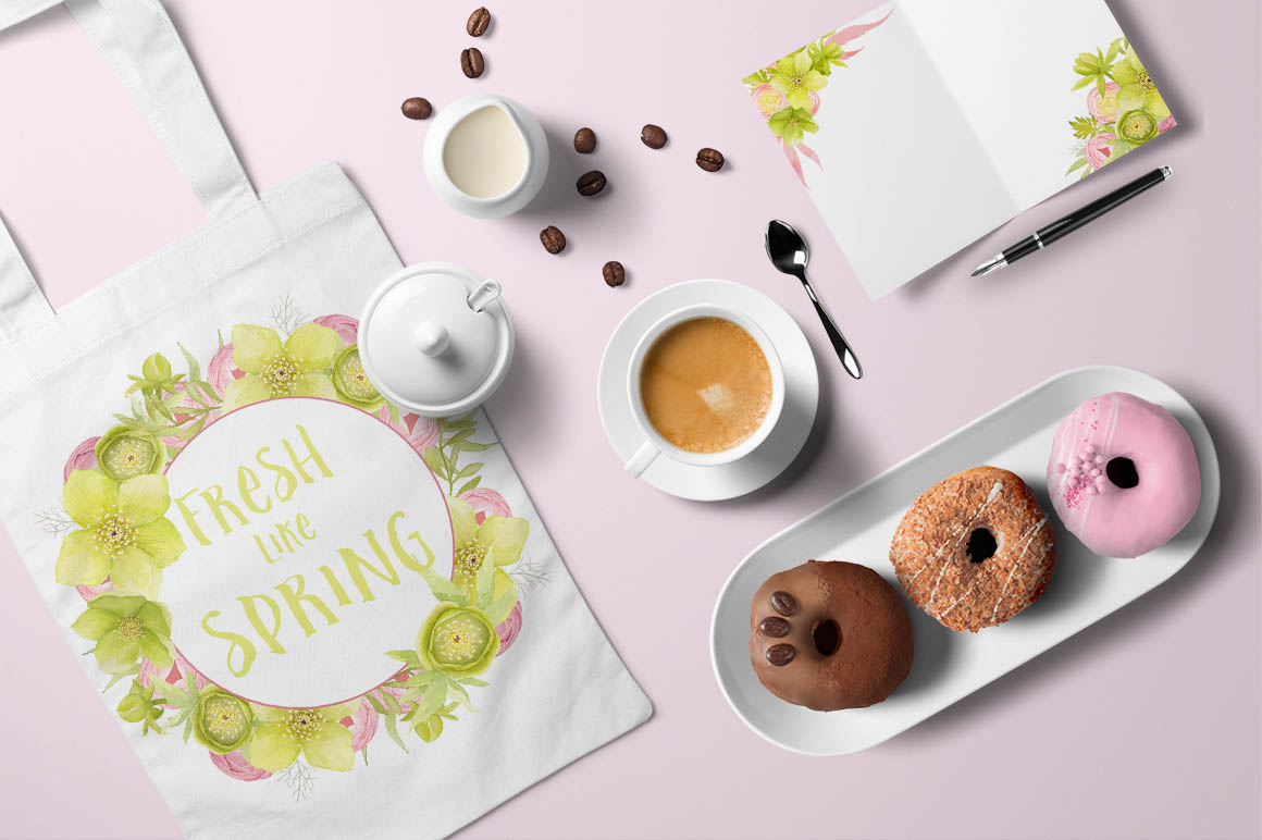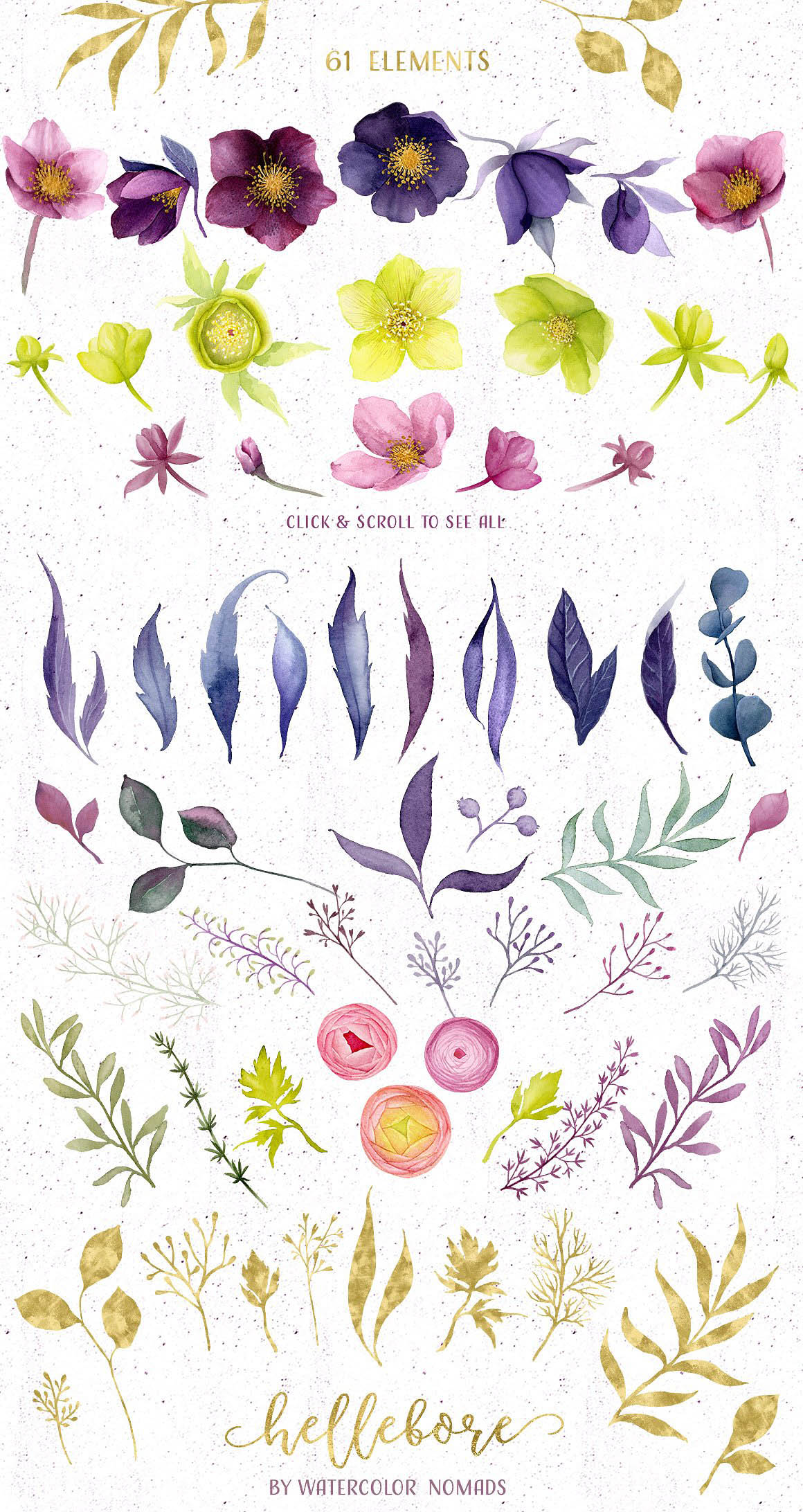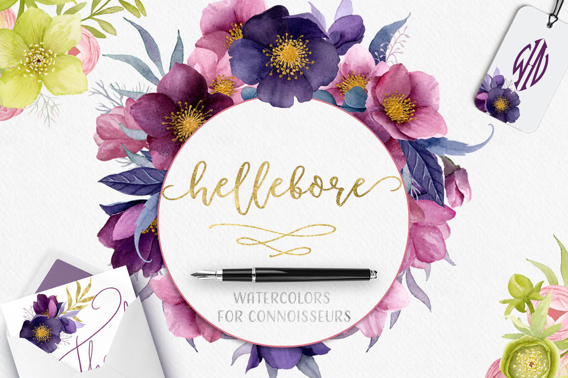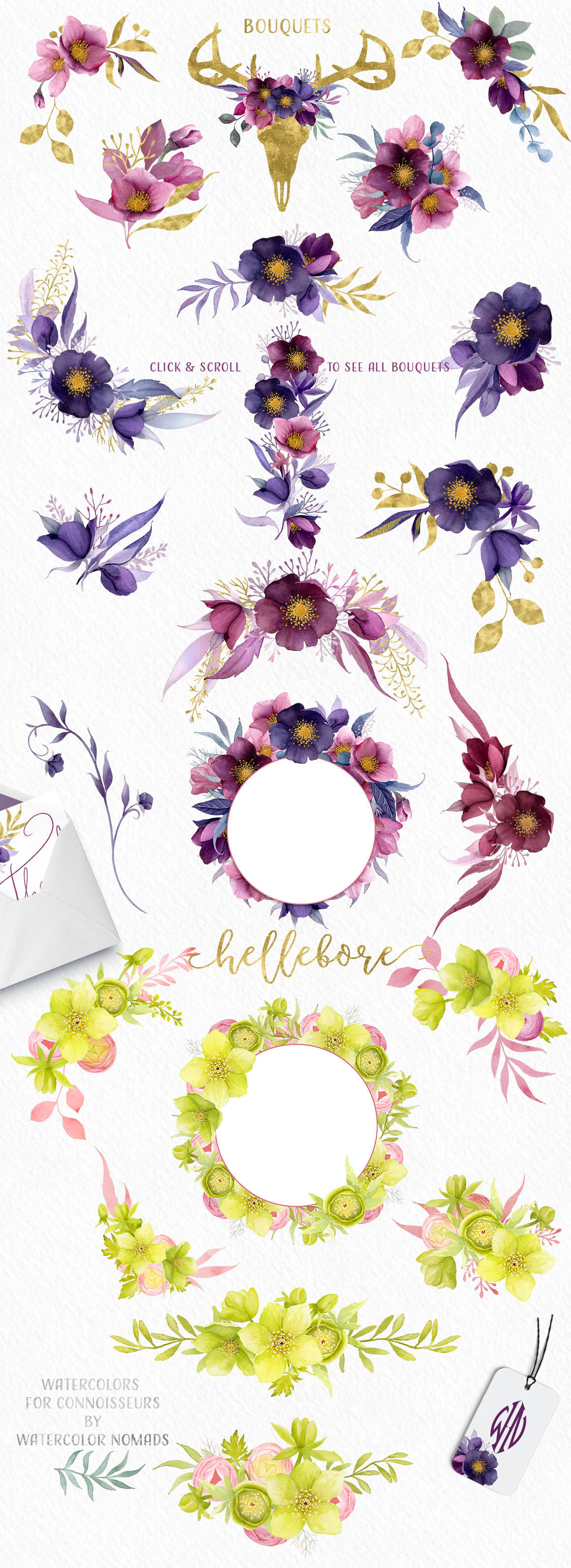 Hellebore is new watercolor clipart illustration collection, that doubles as designer kit, since except the 61 elements it contains 18 large bouquets, frames and borders.