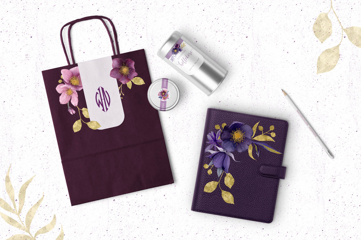 Hellebore is a feminine collection with deep purple, pink green and gold elements, that cover both Spring and Fall Hellebore flowers. Perfect for luxurious female oriented packaging and product design, wedding stationery, textiles and more.