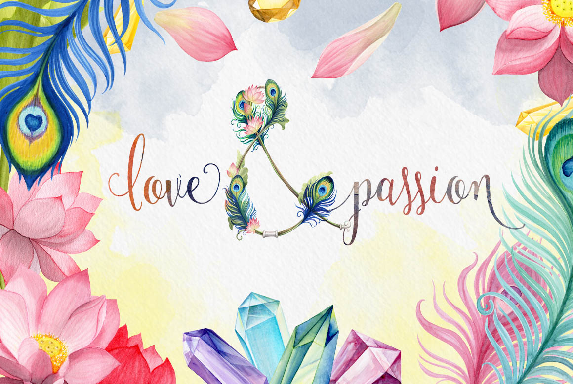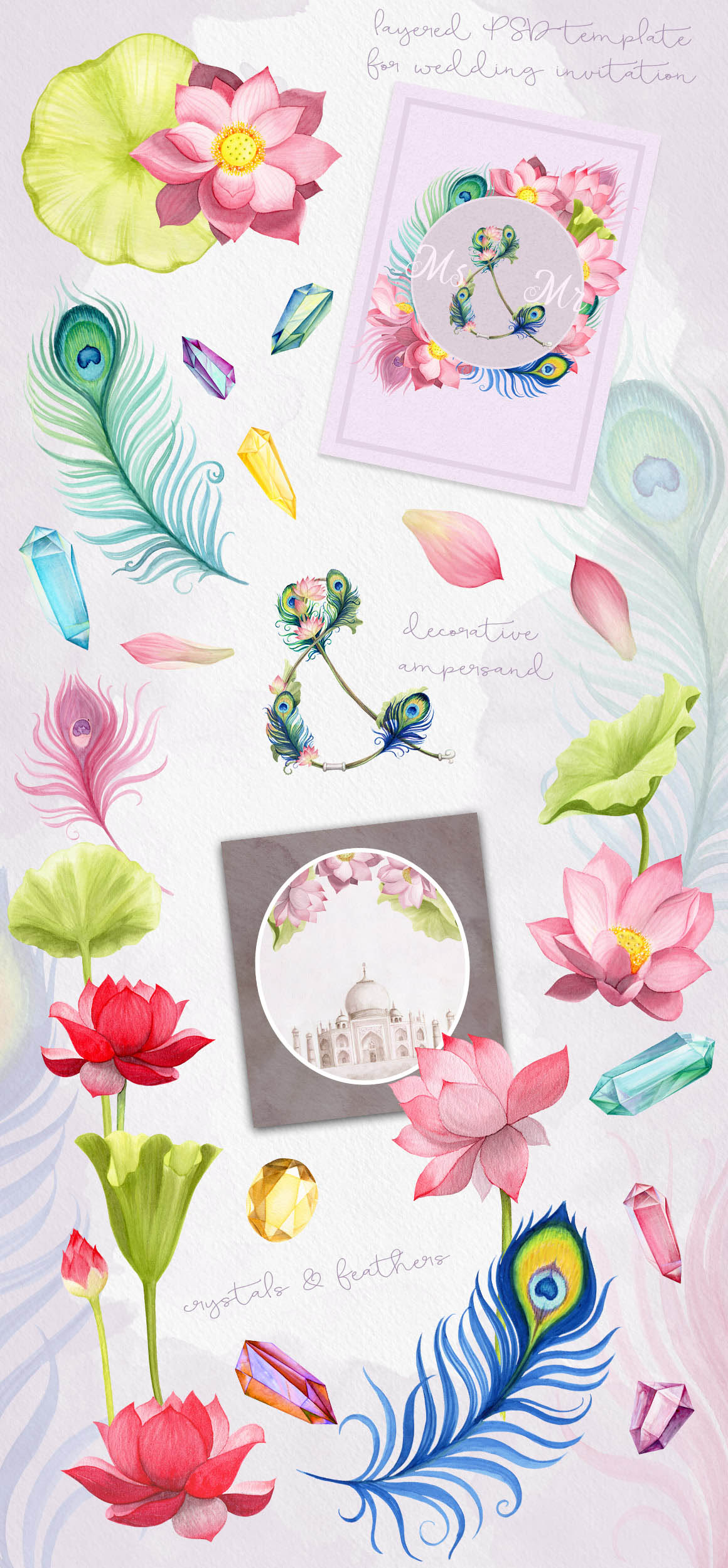 Love & Passion is a watercolor flower collection based on the symbolism of Taj Mahal and the Lotus flower. Illustrated ampersand symbol complements the flowers and peacock feathers and makes this bundle perfect for designs for couples, weddings, anniversaries, Valentine etc. We have included two layered PSD templates of cards or invitations. All images except the templates are 300 dpi transparent background PNG.