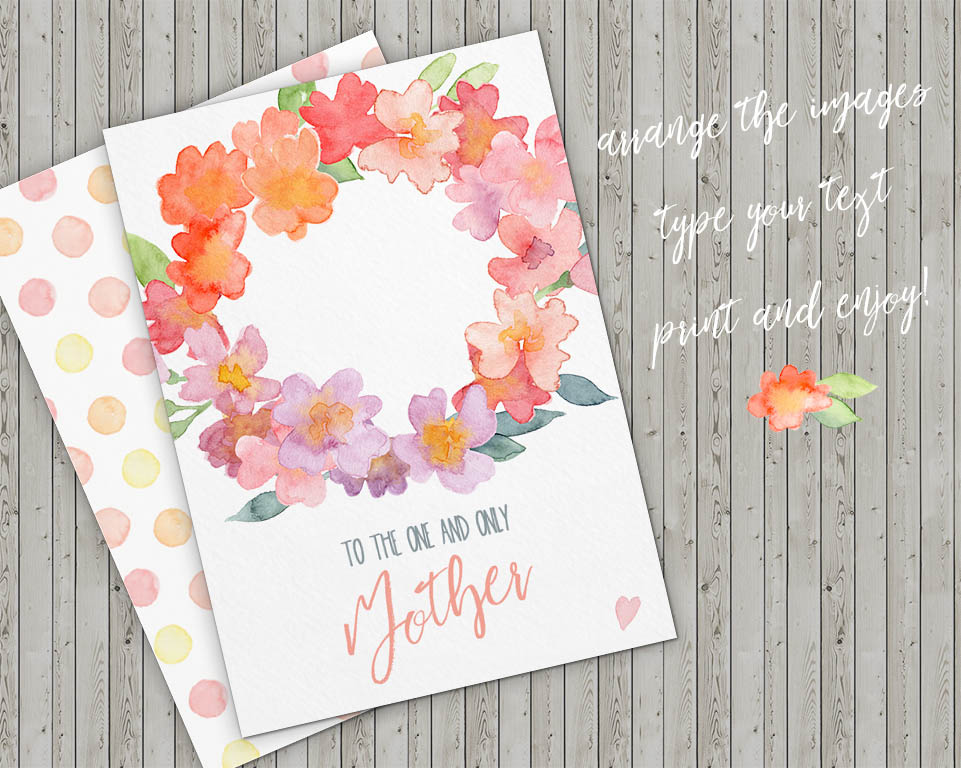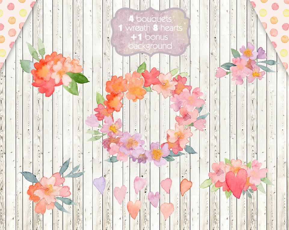 Mother – collection of hand painted watercolor images with spring flower bouquets, wreath and tiny hearts. To make it even easier for you to design and embellish your Mother’s Day cards (or actually any other occasion with flowers) we have included a matching watercolor dot backgrounds.