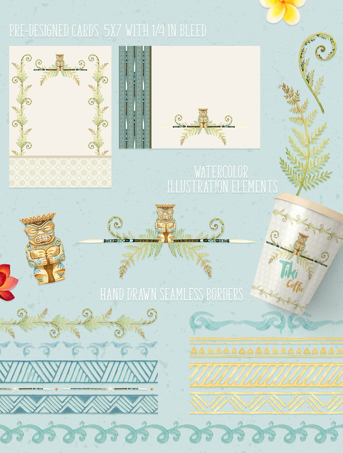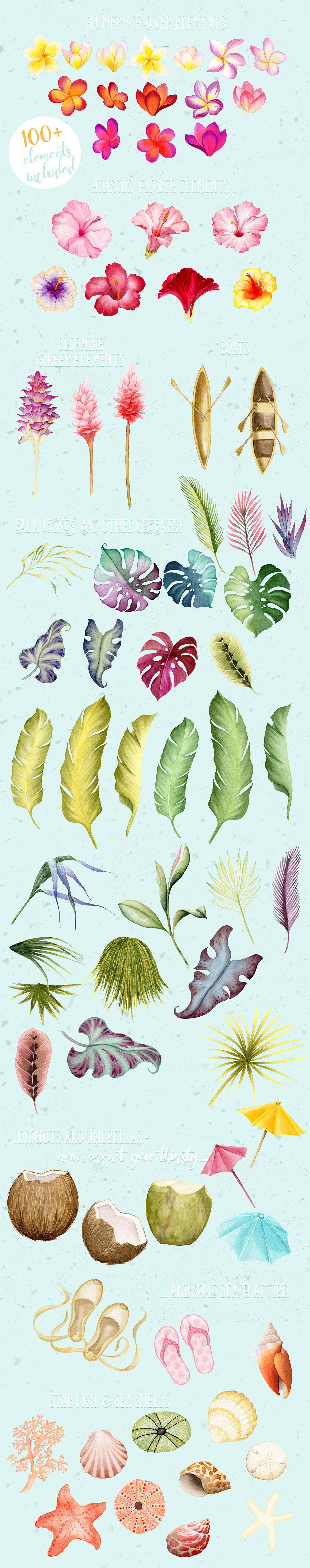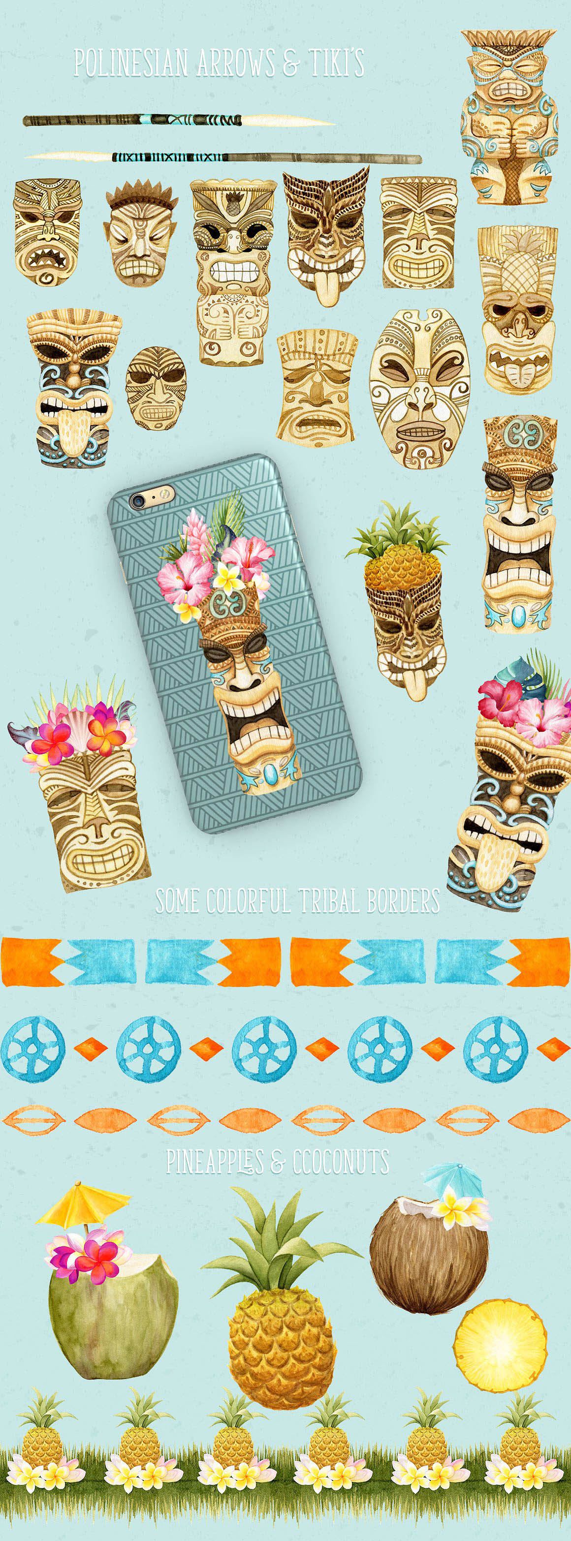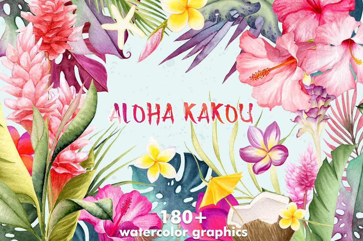 Aloha Kakou means may there be love between us and this is the essence of our new watercolor design collection. Summer is most often associated with vacations, good time, sea and sunshine, new friendships, good food and drinks. Even more when you imagine Hawaii. We designed this ginormous watercolor collection of Hawaiian flowers, plants, patterns, tiki totems with such a Summer in mind. It will allow you to effortlessly design Luau party invites and decor, greeting cards, wedding suites, flyers, tiki bar menu, digital scrapbooking pages and much much more.