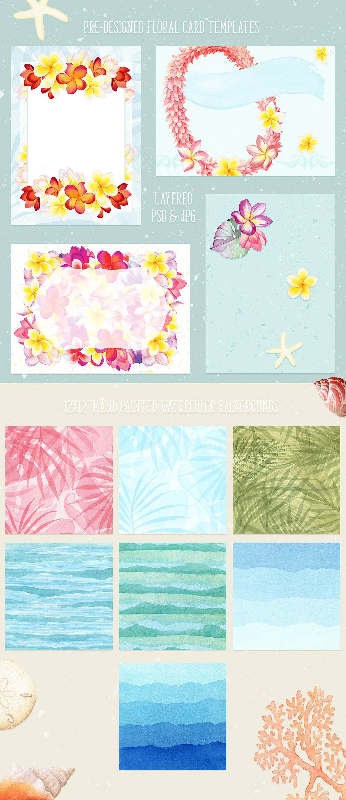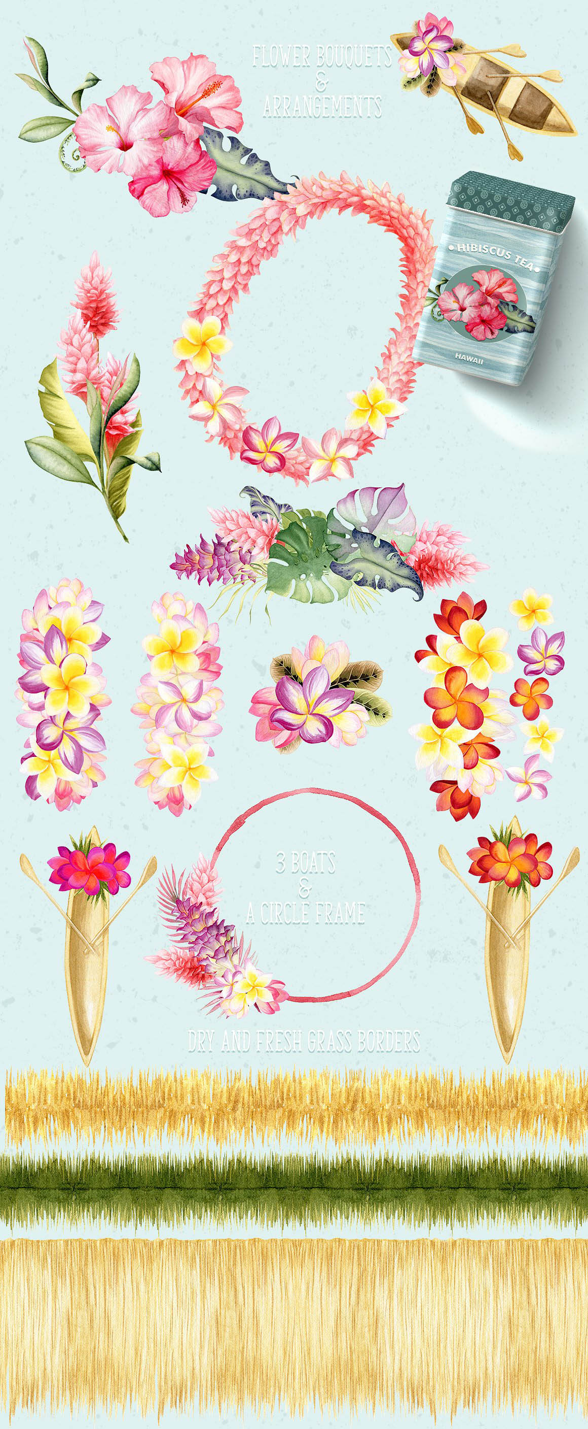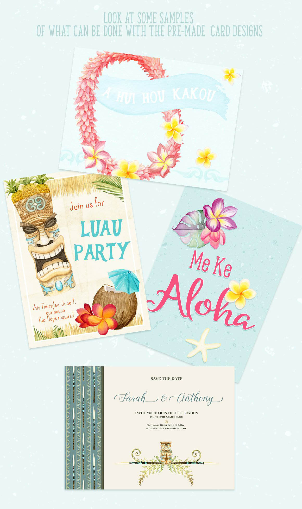 Aloha Kakou means may there be love between us and this is the essence of our new watercolor design collection. Summer is most often associated with vacations, good time, sea and sunshine, new friendships, good food and drinks. Even more when you imagine Hawaii. We designed this ginormous watercolor collection of Hawaiian flowers, plants, patterns, tiki totems with such a Summer in mind. It will allow you to effortlessly design Luau party invites and decor, greeting cards, wedding suites, flyers, tiki bar menu, digital scrapbooking pages and much much more.