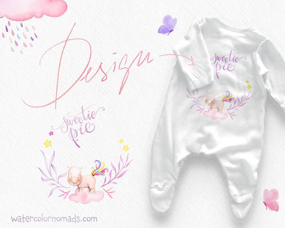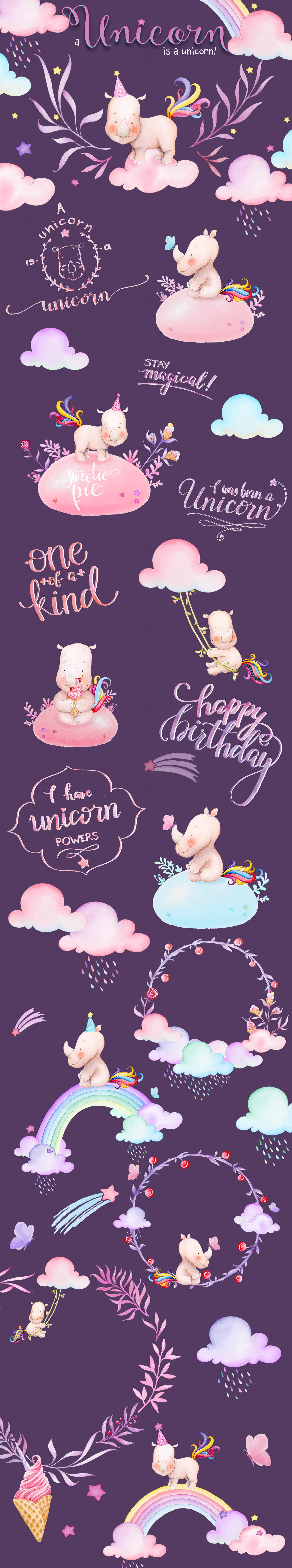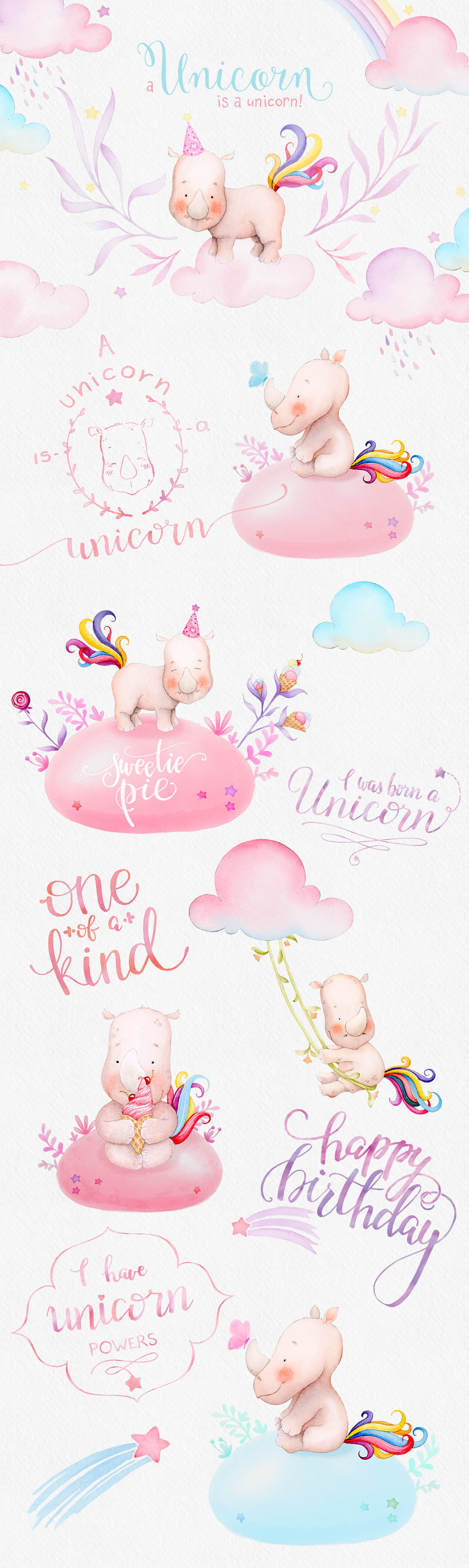 A Unicorn is a Unicorn! A magical watercolor clipart collection! Our unicorn is a chubby little fellow with a gorgeous rainbow tail and a silly smile. He’s going to steal your heart! His magic is perfect for brightening nursery rooms and kids products. No matter if you design a tshirt for toddlers or formula bottle for big company, our Unicorn is your best friend. He’s ordinary gone extraordinary! Perfect also for greeting cards design, birthday party invitations, party decor, textiles, prints and posters, textiles, baby to teen accessories, stationery etc.
