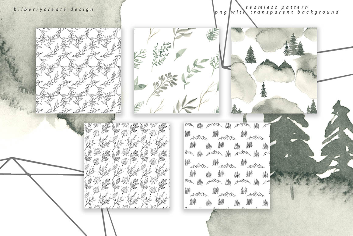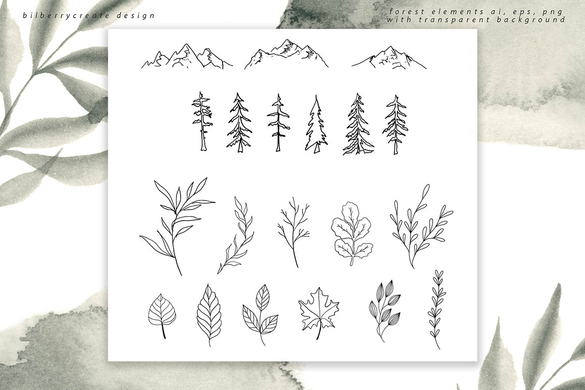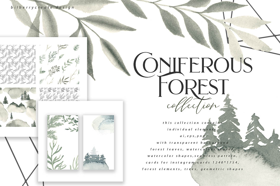 CONIFEROUS FOREST NEW design set filled with individual elements, forest leaves, watercolour leaves, watercolour shapes, seamless pattern, cards for instagram, cards 1240*1754, forest elements, geometric shapes. Be sure to click on the image to see all elements. This product was created to help you make your digital images even more beautiful and unique. This pack can be used to create anything as you wish, logos invitation cards, make scrapbooking, wedding cards, birthday cards, home decor, packaging holiday gifts, party decorations, print on fabrics and so much more. These elements are ideal for the creation of the corporate identity of your flowers shop or your small store. Or if you suddenly need to decorate your room or create a wedding invitation. Add this beautiful flowers and leaves to create a postcard.