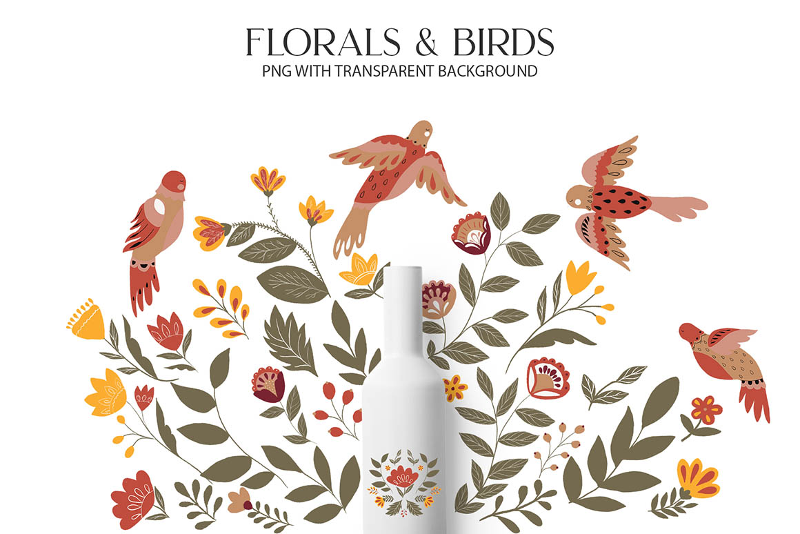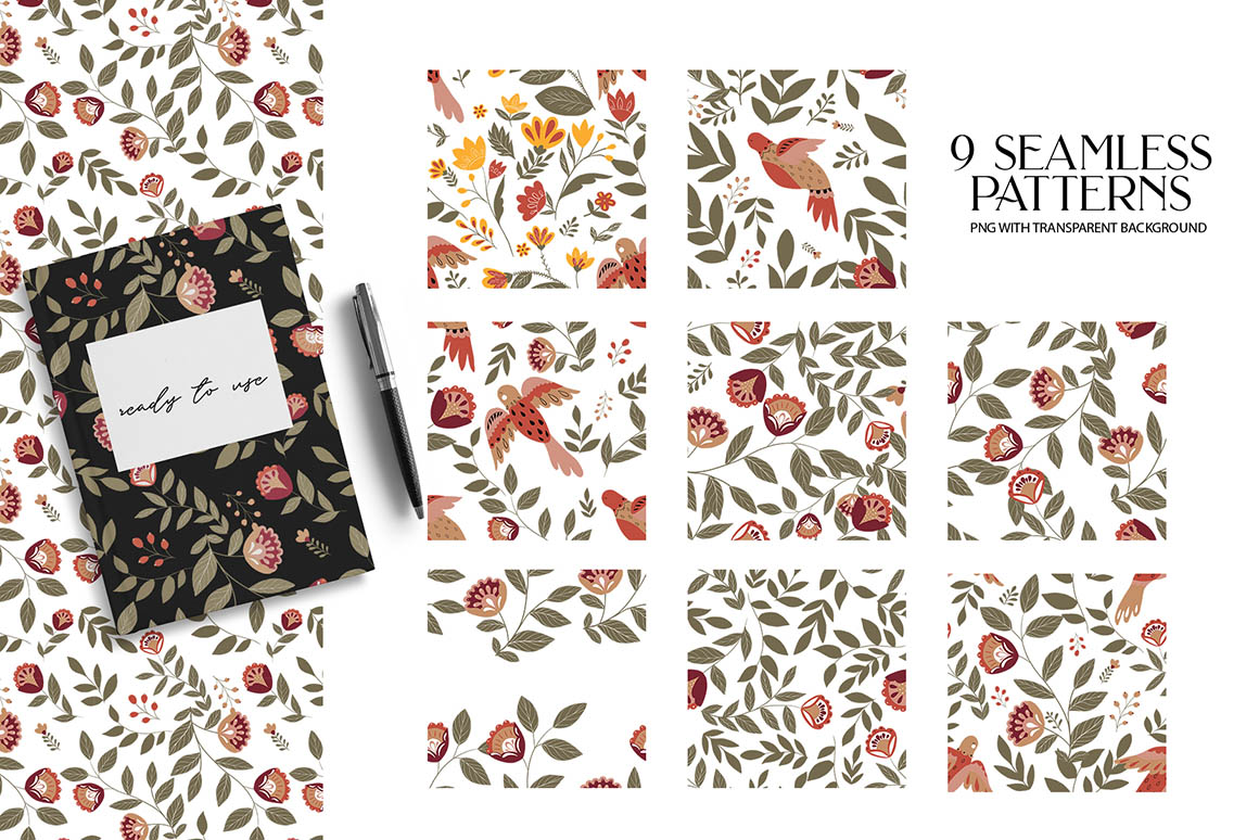Fantasy Folk Art design set filled with individual design elements, , seamless pattern and ready to use compositions. Be sure to click on the image to see all elements. This product was created to help you make your digital images even more beautiful and unique. This pack can be used to create anything as you wish, logos invitation cards, make scrapbooking, wedding cards, birthday cards, home decor, packaging holiday gifts, party decorations, print on fabrics and so much more.