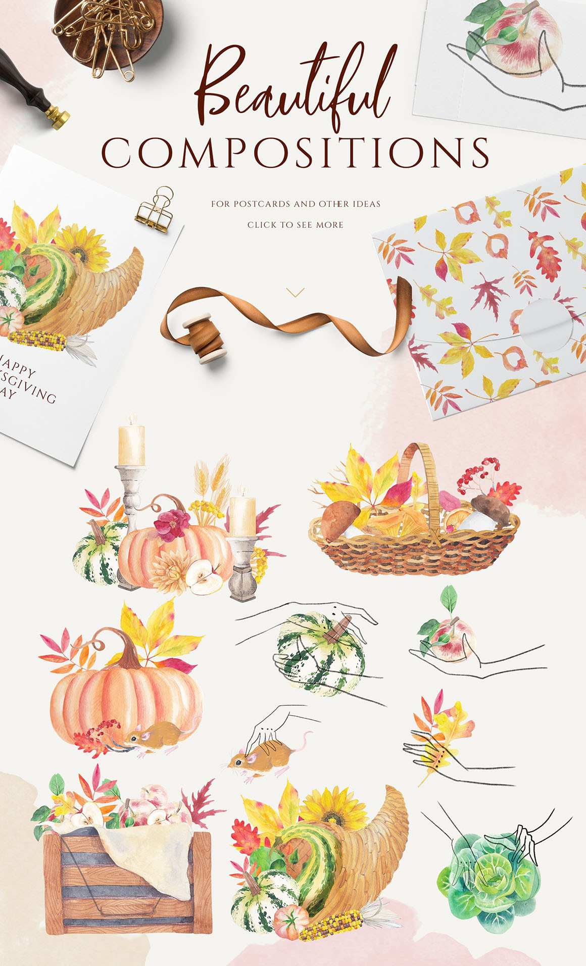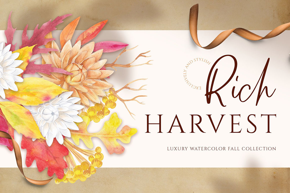 Rich harvest is a luxury fall watercolor collection, looks stylish and elegant. Will be perfect for moody, country and rusty lovers. I made several ready-for-use compositions for postcards, posters and invitations, but you can also combine everything or your own. Combine elements with each other to create interesting compositions Use pre-made patterns for kitchenware, aprons, napkins and so on. Make you Thanksgiving Day unusual and beautiful.