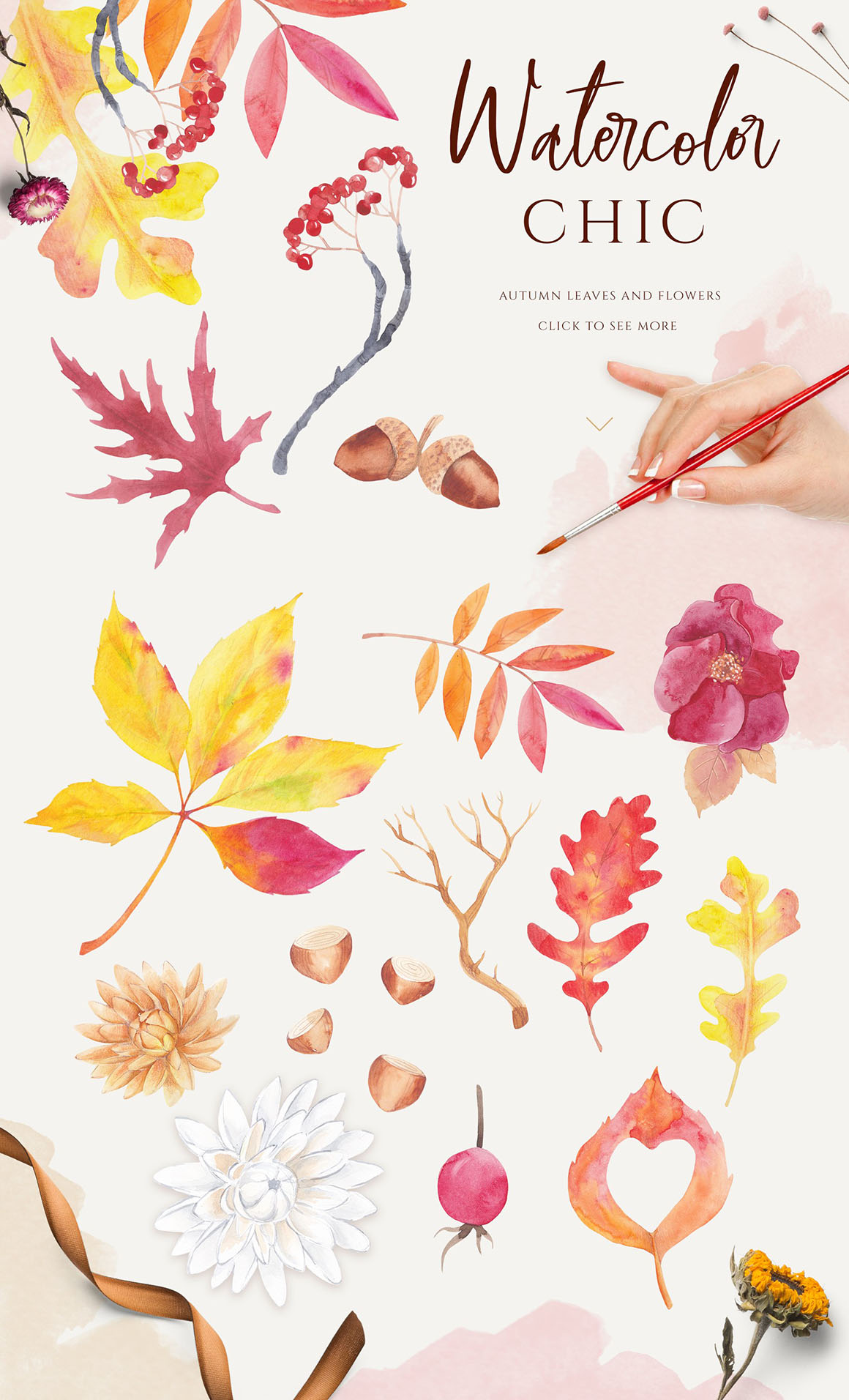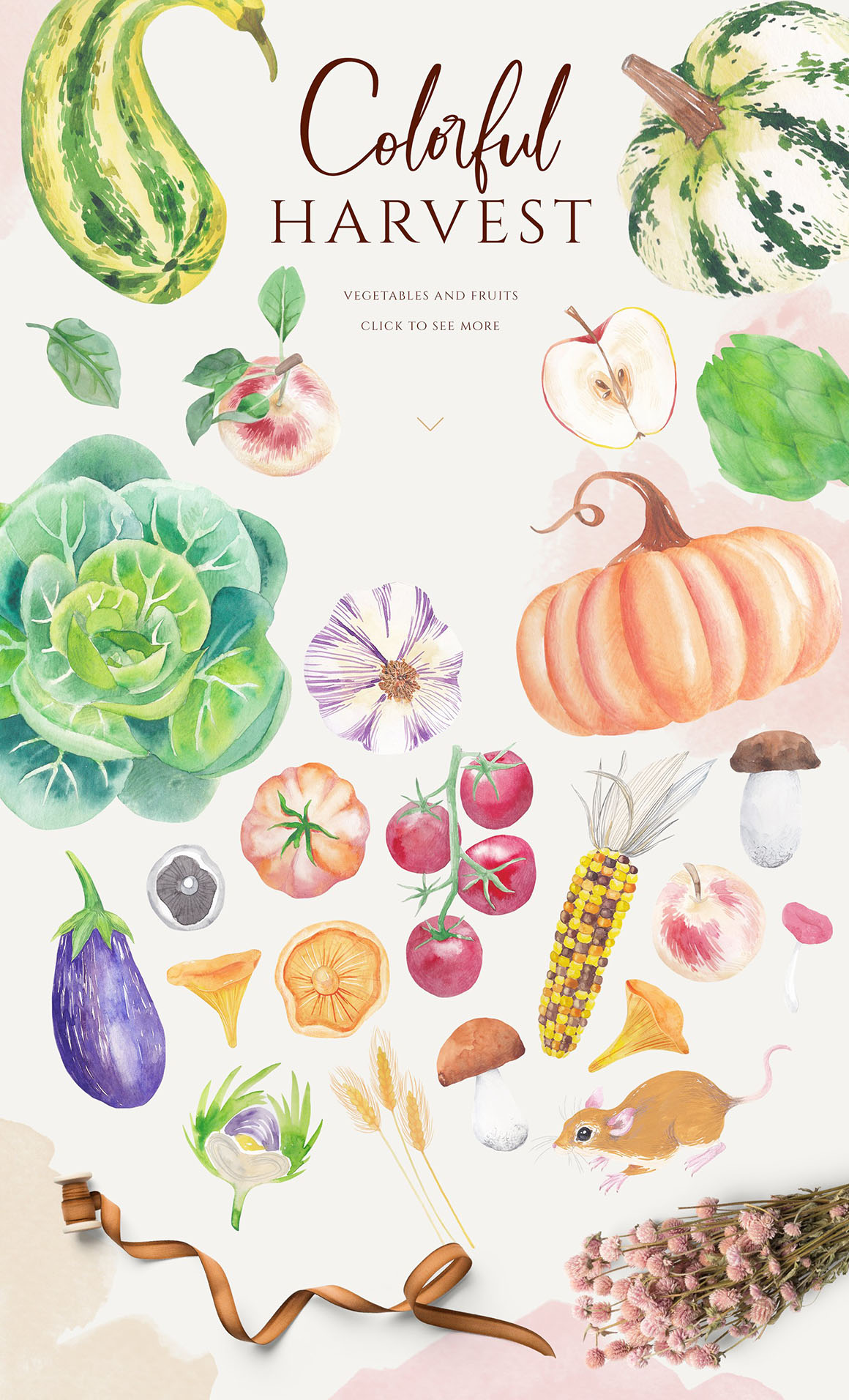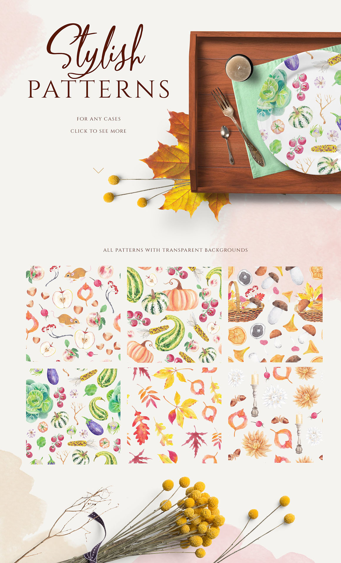 Rich harvest is great for digital scrapbooking, creating invitations, decorating publications about interior and gardening, blogs and websites. A large amount of elements will allow you to create an infinite number of interesting combinations. Also perfect for diary, planners, stickers, posters, wall art, cards, moodboards, to do lists, branding identity, modern greeting cards, calendars, surface patterns, scrapbooking, social media accounts promotion (Instagram, Pinterest), Etsy, gift wrapping paper, textile design, advertising, social media, packaging, logo, quotes, blogs, web, banners and so on.