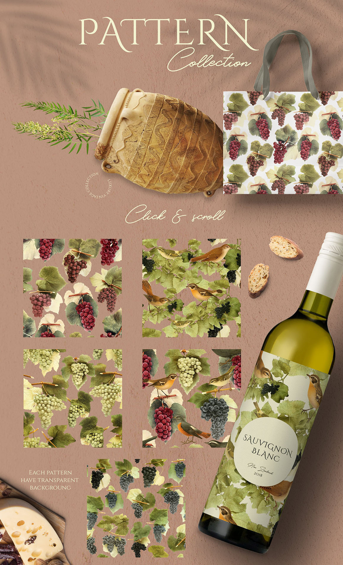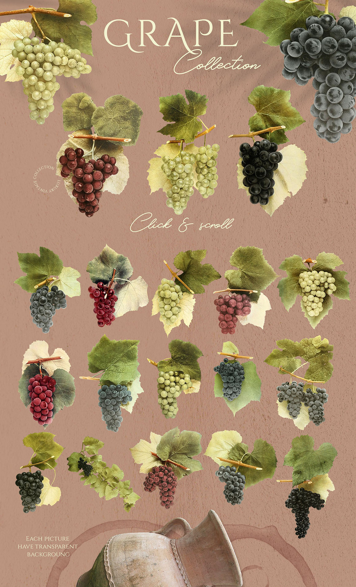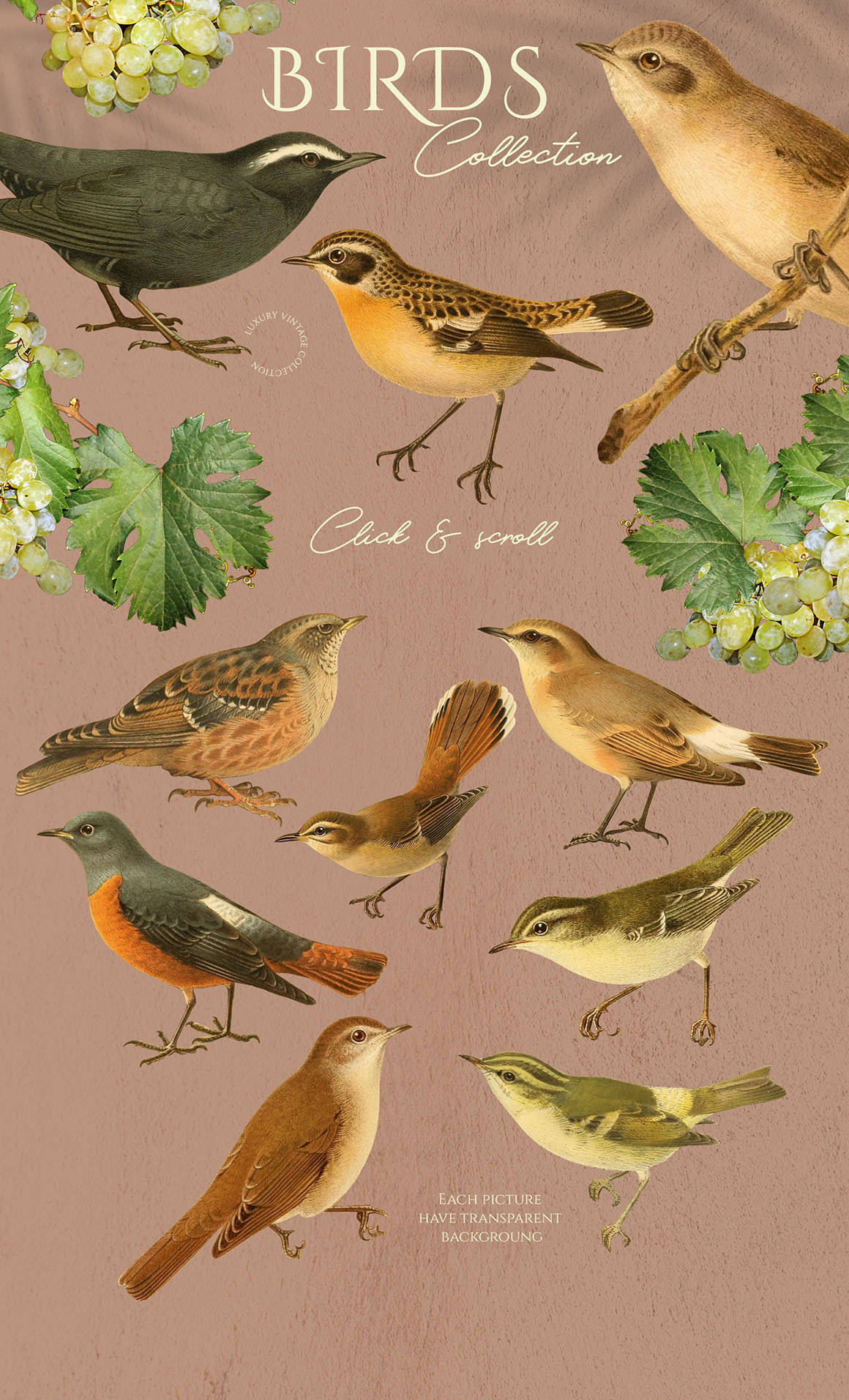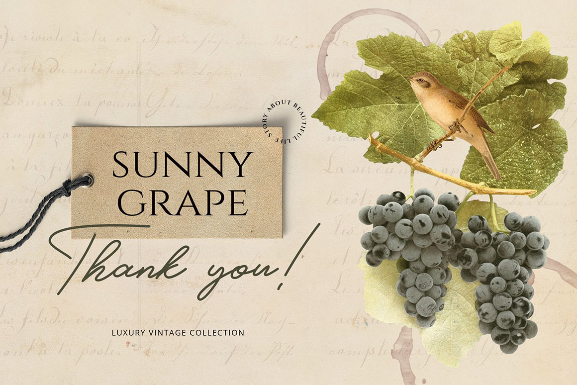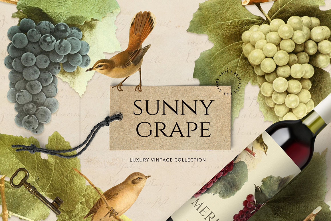 Sunny collection of hi-res PNG transparent images were carefully crafted from vintage botanical books. Different sorts of grape and little cute birds ideal for homemade wine and not only. Perfect for art prints, wedding invitations, posters, packaging, brand design, social media, collages, web design, scrapbooking and more. Also I prepared 5 seamless patterns for your design ideas.