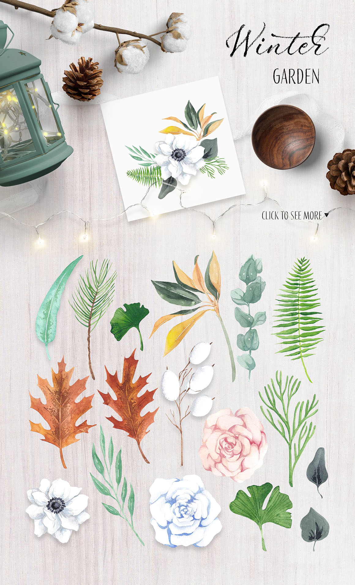 - 51x PNG watercolor elements 3000*3000 px with transparent background (plants, vegetables, fruits, decor elements, flowers, kitchenware, and mouse – see full previews)