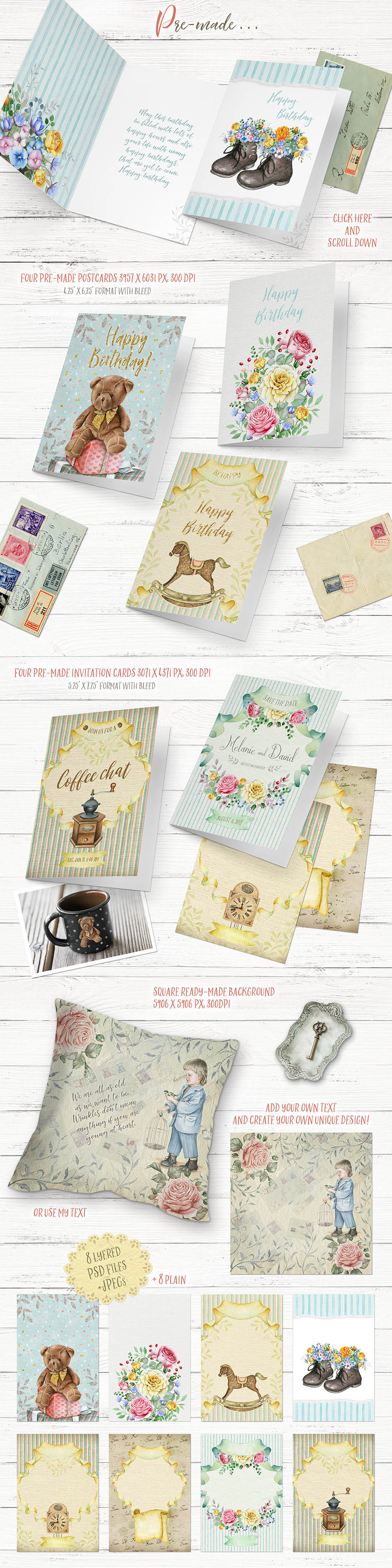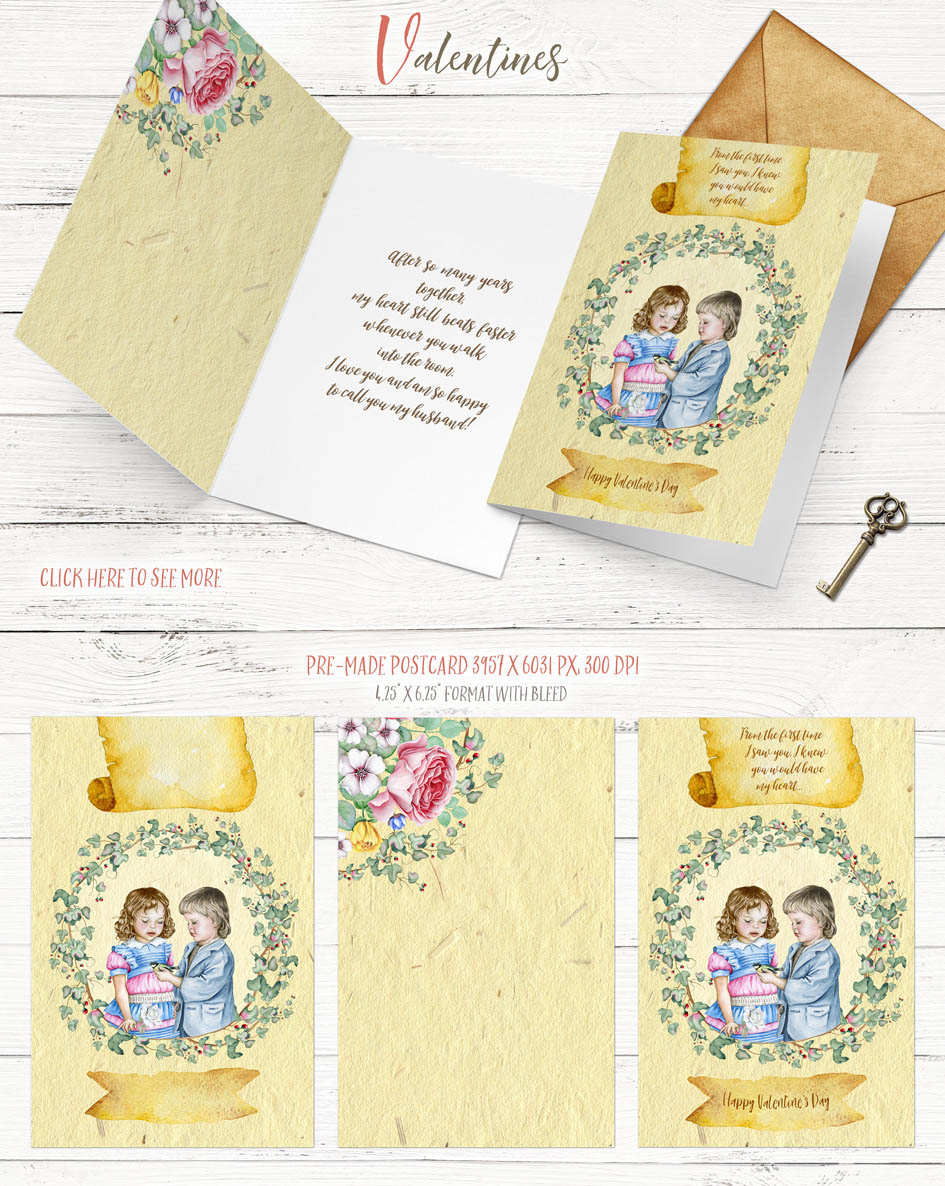 All files are high-resolution (300 dpi). Ready-made card templates are layered and available in both PSD and JPEG format. Pre-made invitation cards are 3071 x 4371 px, 300 dpi in 5.25” x 7.25” format, pre-made postcards are 3957 x 6031 px, 300 dpi in 4.25” x 6.25” format. Their real size is large, in case you would like to use them for other projects. They have bleed and could be printed on larger sheet and then cut down.