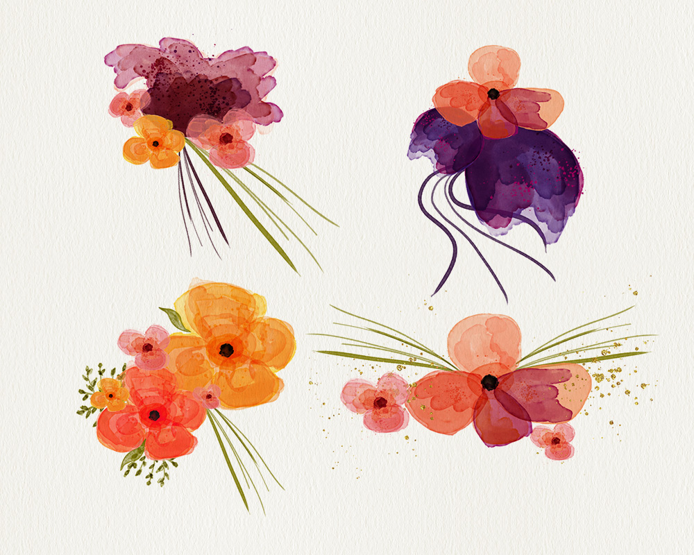 4 Watercolor Floral Elements – Ideal for invitations, wedding invitations, handmade craft items, scrap booking, printed paper items and more.