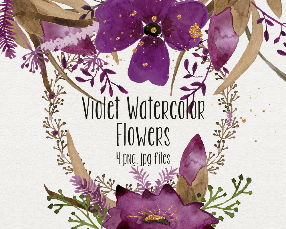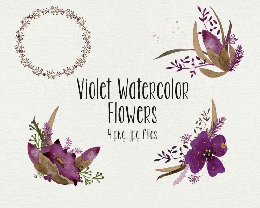 4 Violet Watercolor Flowers – Ideal for invitations, wedding invitations, handmade craft items, scrap booking, printed paper items and more.