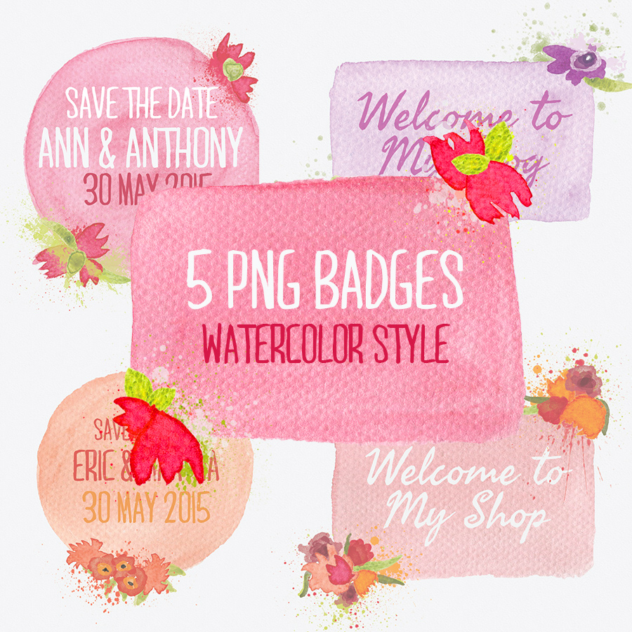 5 Hand made watercolor badges – png files is a good addition to many designers projects.