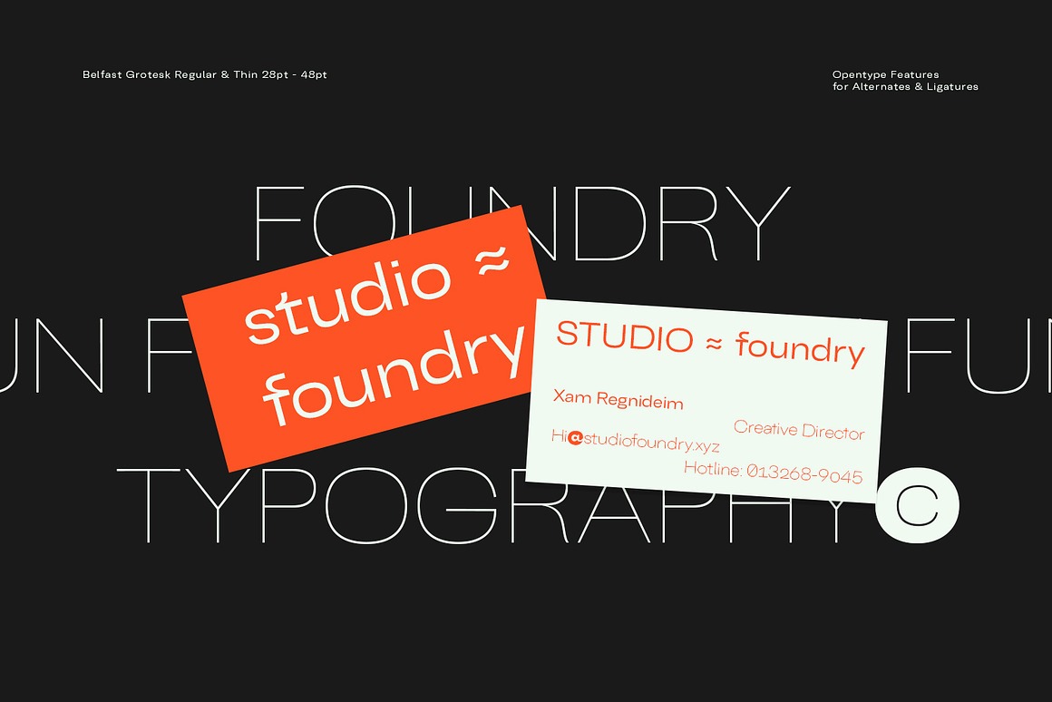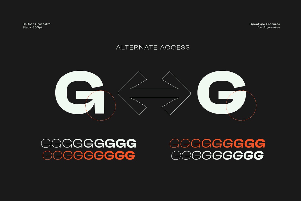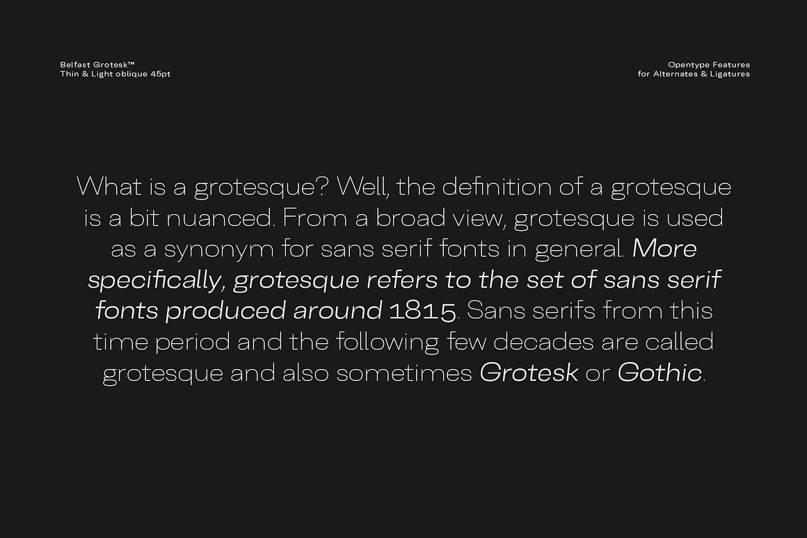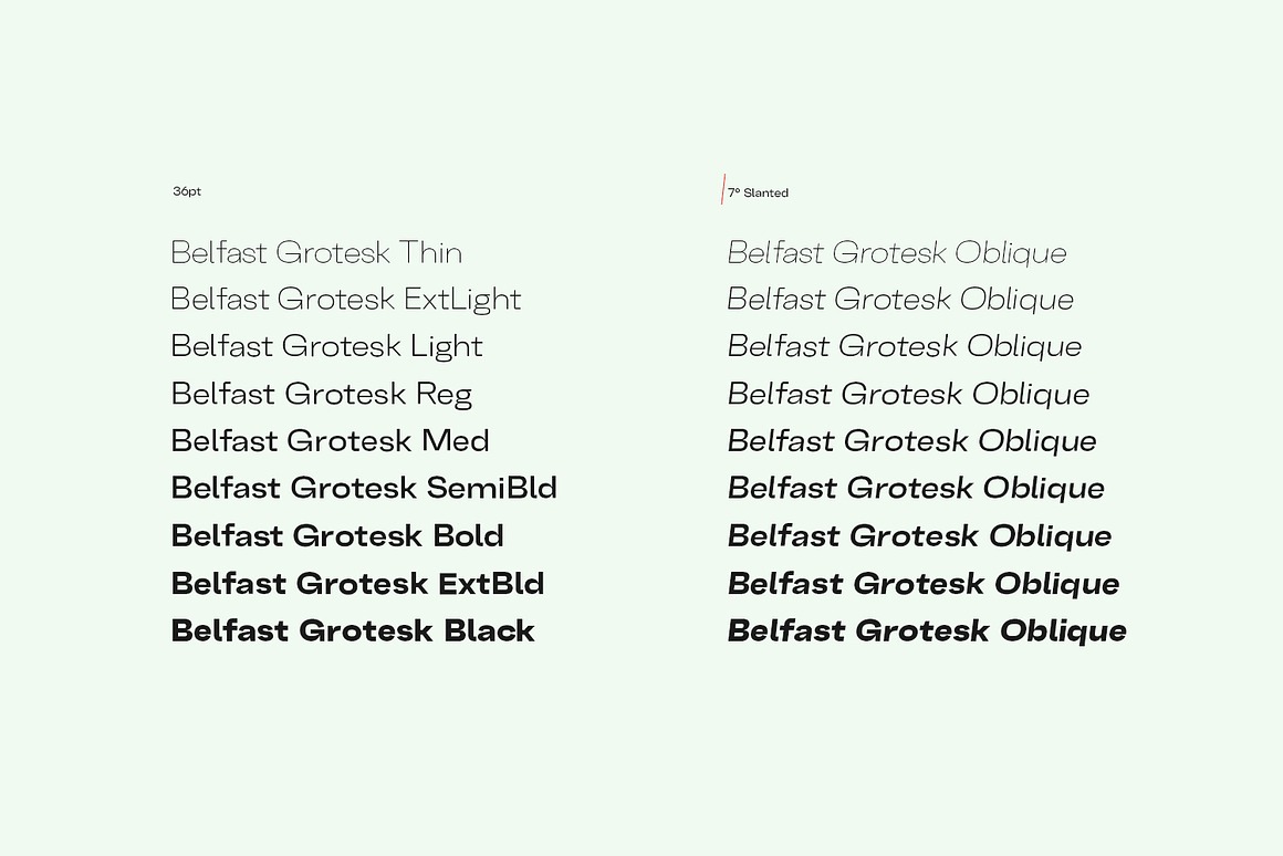 Influenced by the grotesk typefaces developed in the early 20th century. Attempts to follow the best traditions of Grotesk typefaces. A good amount of contrast between the stroke thickness of each weight. Belfast Grotesk™ was developed with unique glyphs to offer best flexibility.