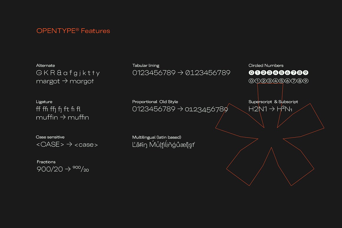 Including tabular figures, alternate characters, ligatures, fractions, case-sensitive forms, superscripts, subscripts etc.
