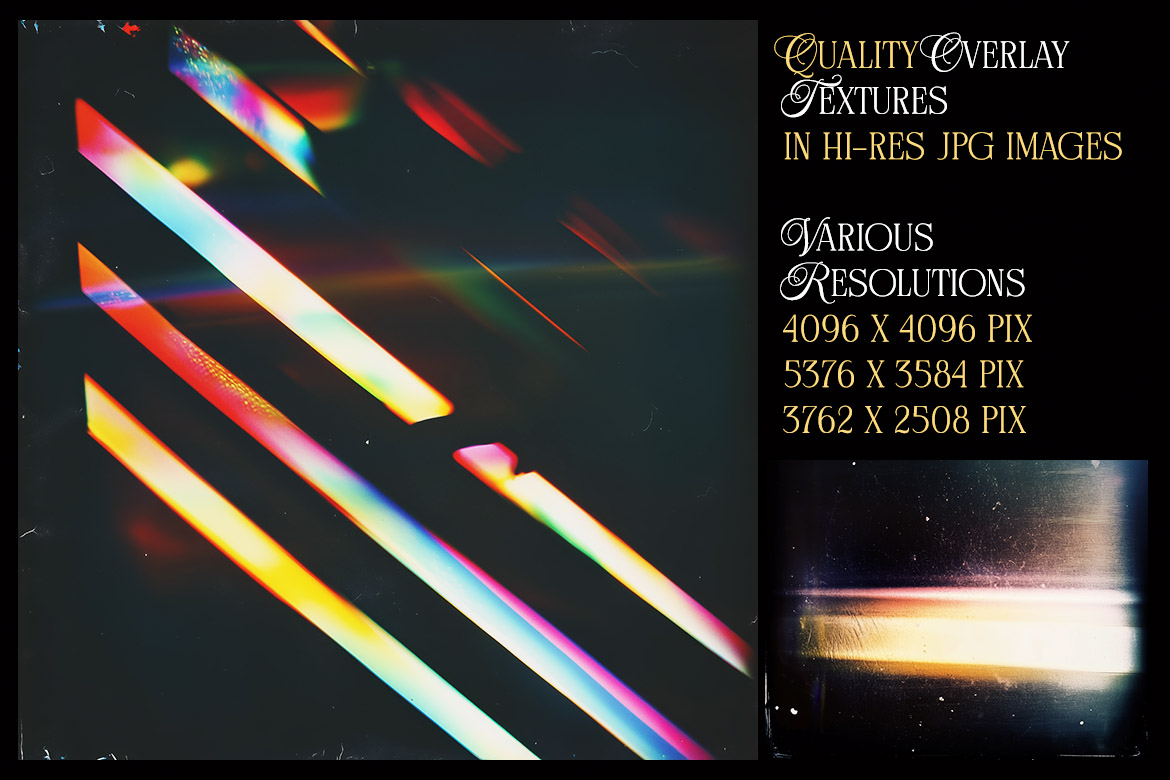 - Great effects for your photos or illustrations – very easy to work with these overlay textures in any graphic app supporting layers and working with images!