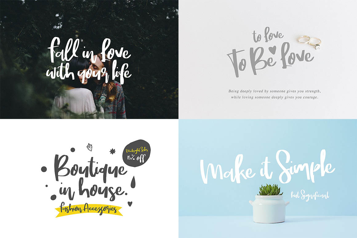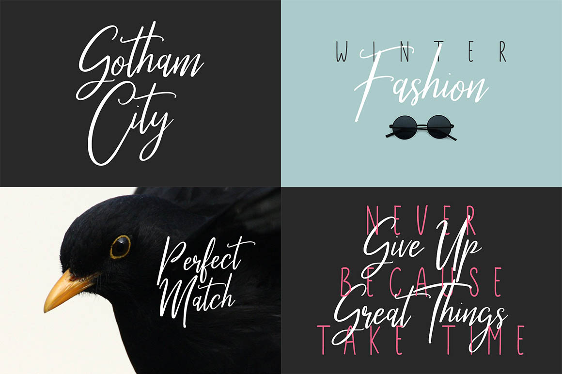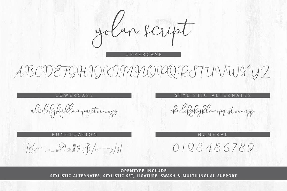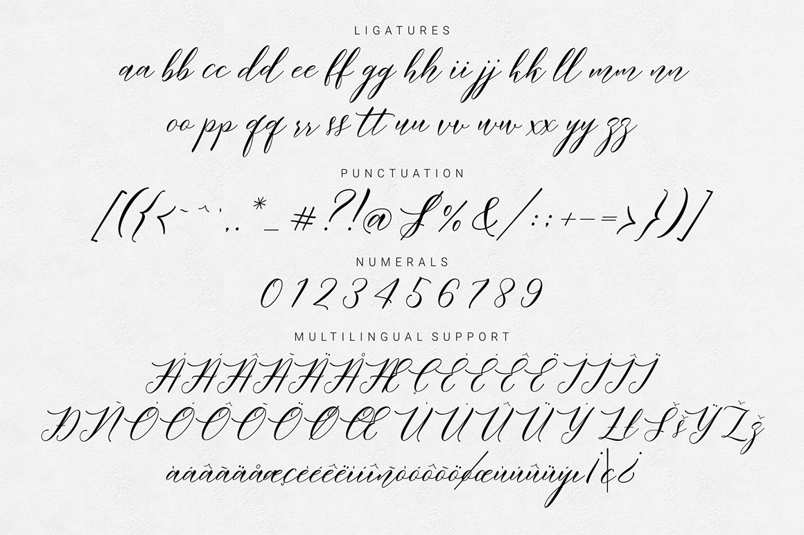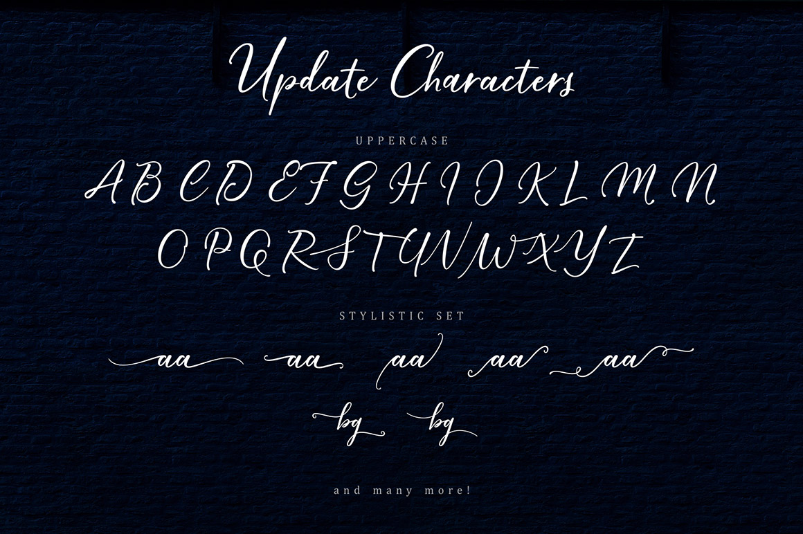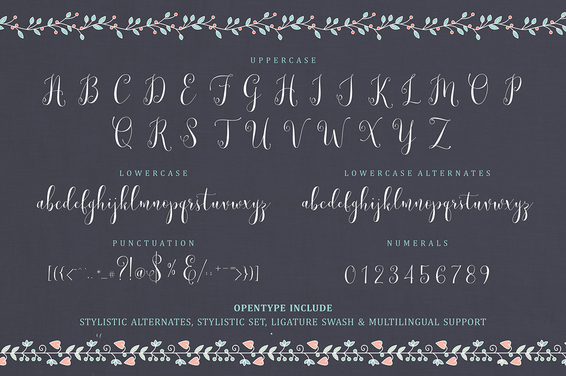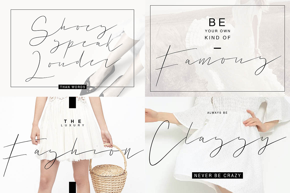 This is a new font script with a unique and thin style. Not only unique, the font is made in detail also has an elegant style, sweet, simple and firm character. With a unique style that dancing, this font can make your design more alive. When you use this font sometimes you do not need to use other fonts pairing, this font can be used in single, but still as you wish! If you are curious, please try it! With a style like this, this font will be suitable in use for logo’s, branding projects, homeware designs, product packaging, mugs, quotes, posters, shopping bags, logo’s, t-shirts, book covers, name card, invitation cards, greeting cards, and all your other lovely projects. You can use this font for your job very easily. Because there are many features in it. Contains the complete set of lower and uppercase letters, punctuation, numbers, web fonts, and multilingual support. This font also includes several ligatures and alternative style Stylistic Set For those of you who have software that is capable of working OpenType (Corel Draw / Photoshop / Illustrator / InDesign).