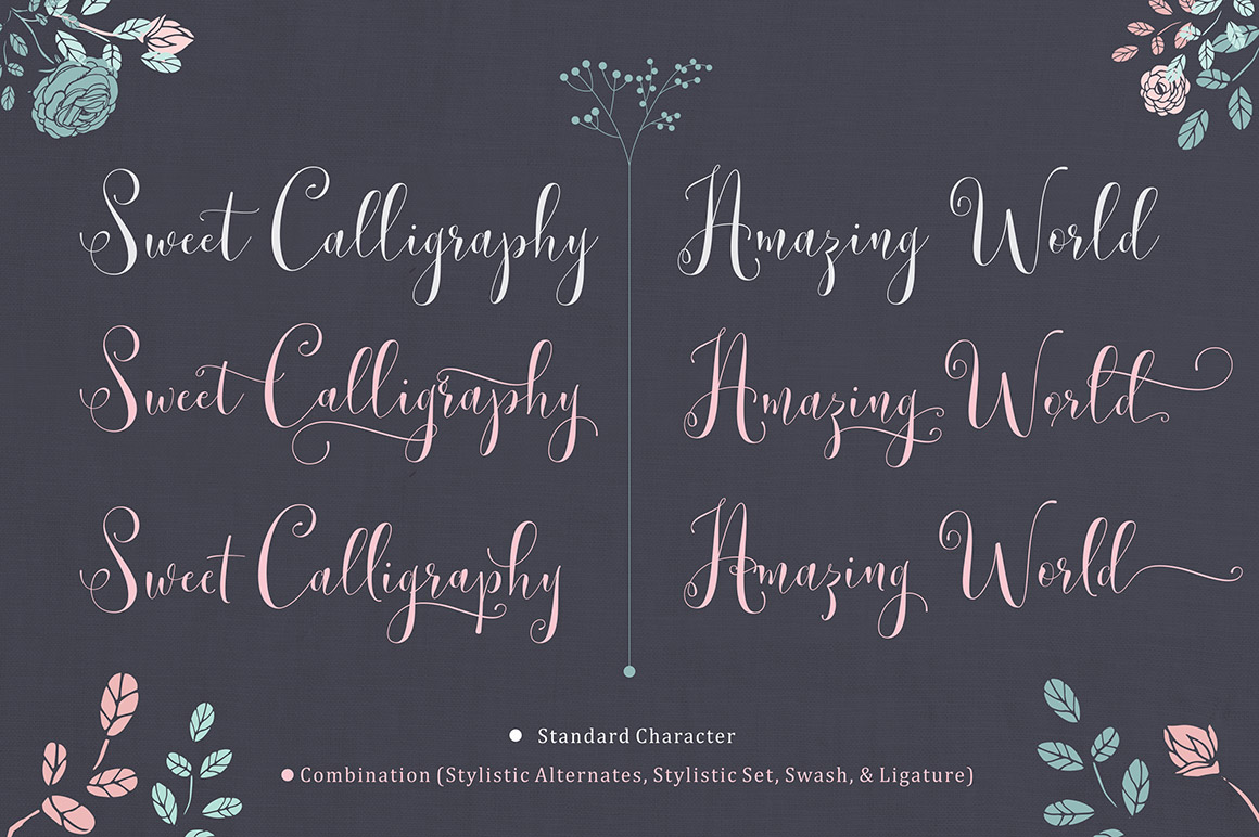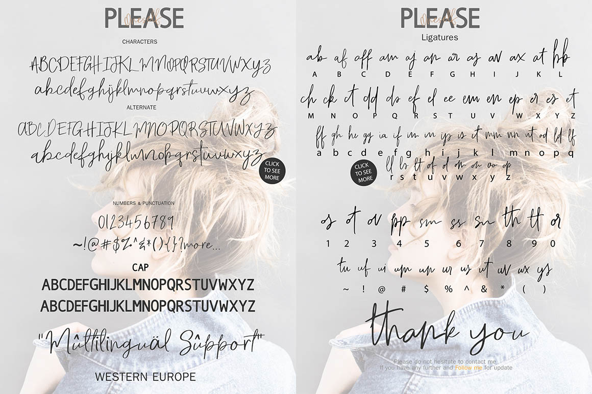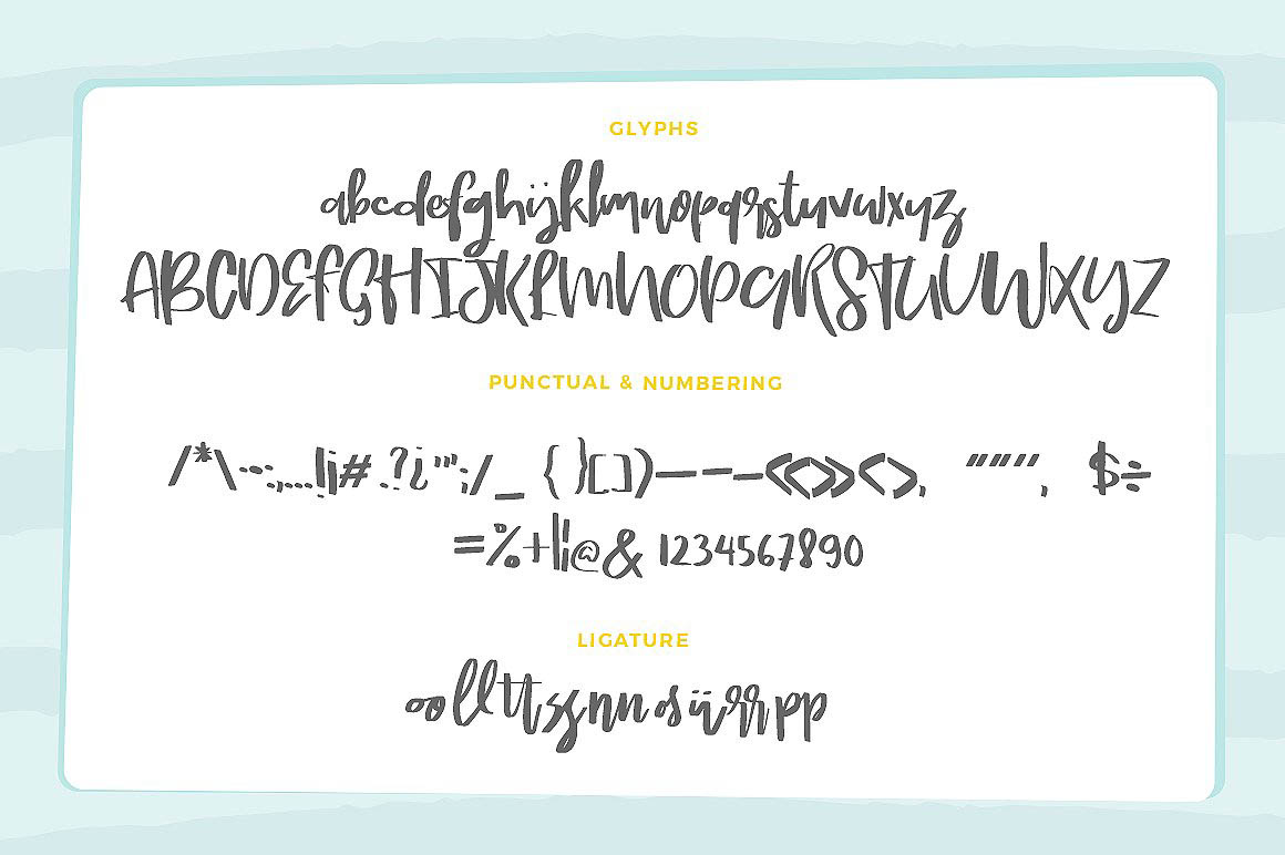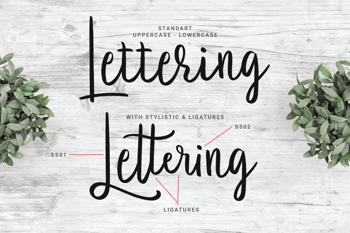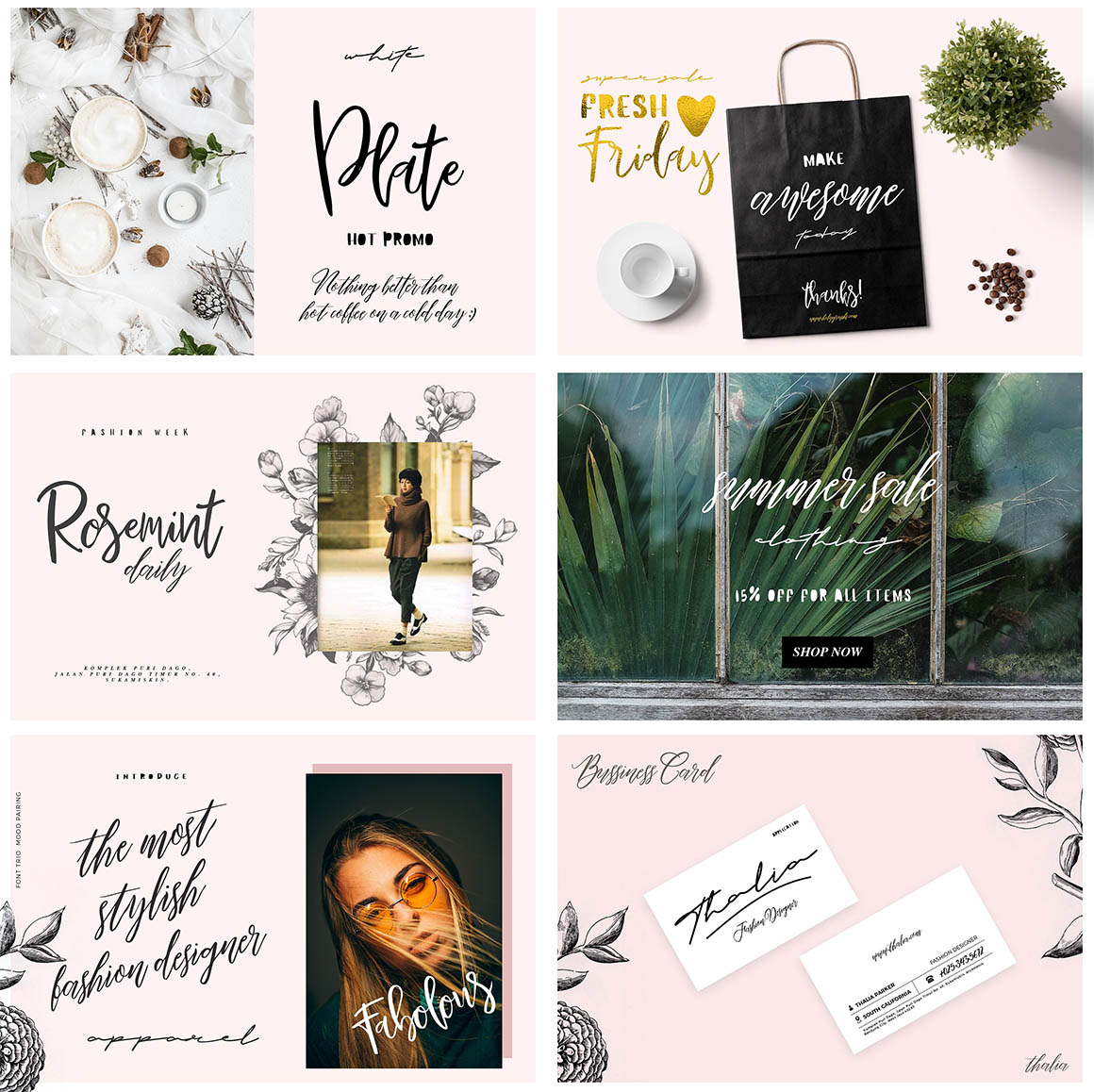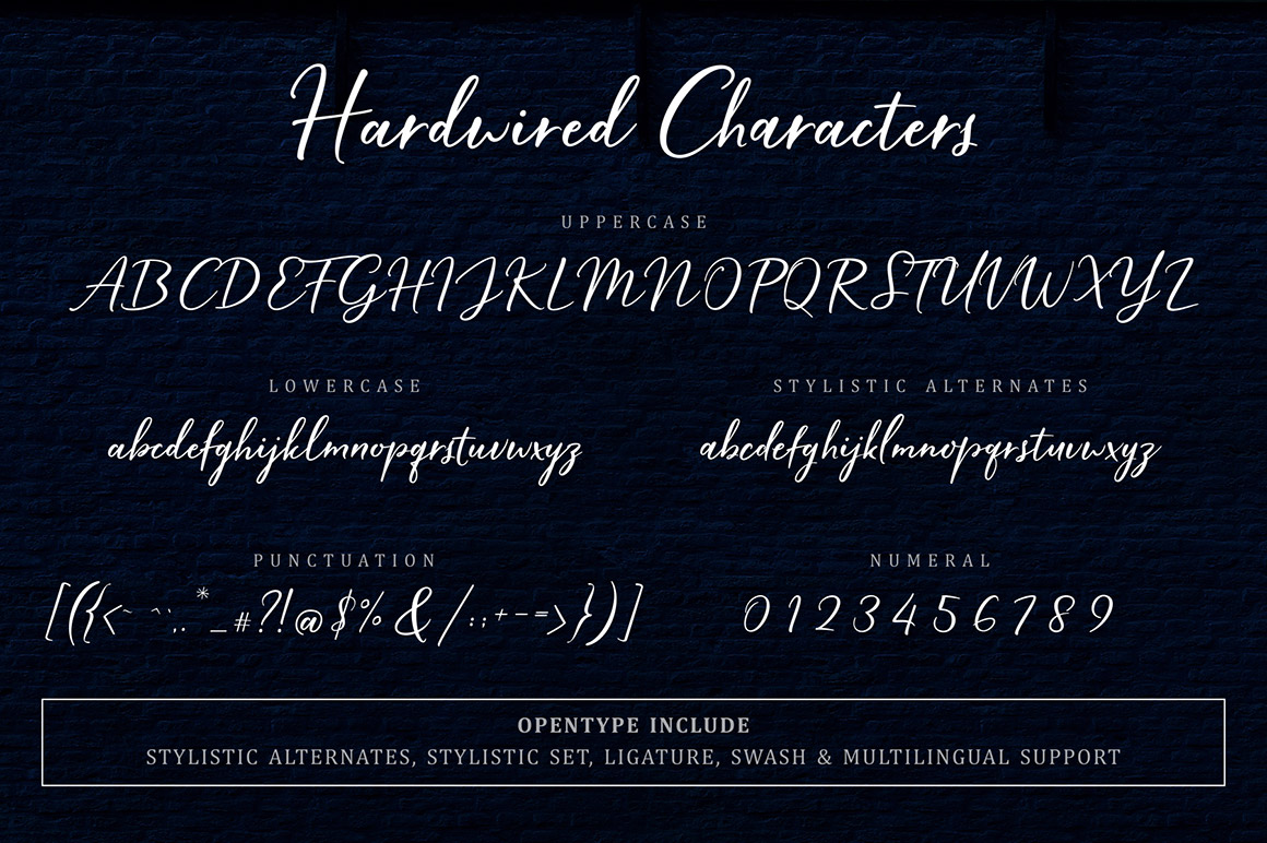 This is a new font script with a unique and thin style. Not only unique, the font is made in detail also has an elegant style, sweet, simple and firm character. With a unique style that dancing, this font can make your design more alive. When you use this font sometimes you do not need to use other fonts pairing, this font can be used in single, but still as you wish! If you are curious, please try it! With a style like this, this font will be suitable in use for logo’s, branding projects, homeware designs, product packaging, mugs, quotes, posters, shopping bags, logo’s, t-shirts, book covers, name card, invitation cards, greeting cards, and all your other lovely projects. You can use this font for your job very easily. Because there are many features in it. Contains the complete set of lower and uppercase letters, punctuation, numbers, web fonts, and multilingual support. This font also includes several ligatures and alternative style Stylistic Set For those of you who have software that is capable of working OpenType (Corel Draw / Photoshop / Illustrator / InDesign).