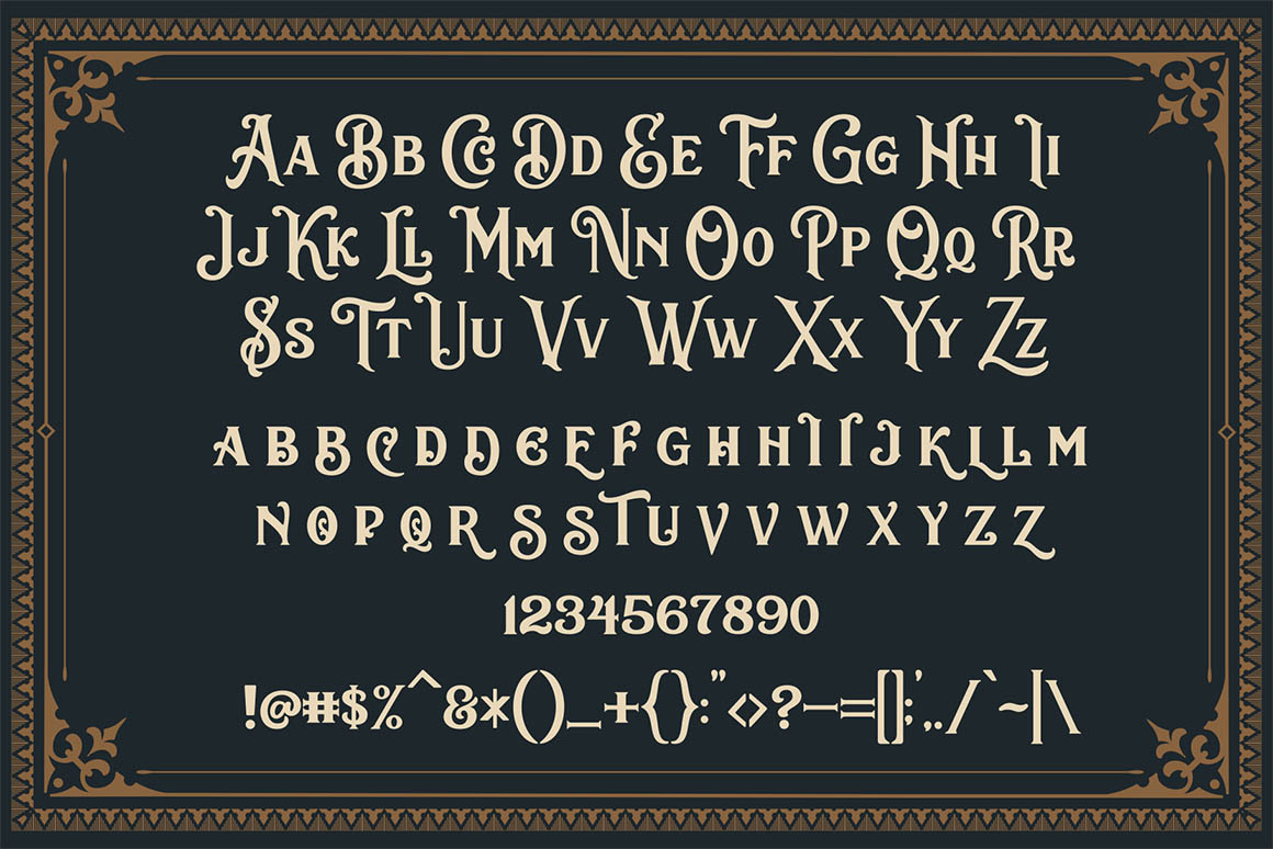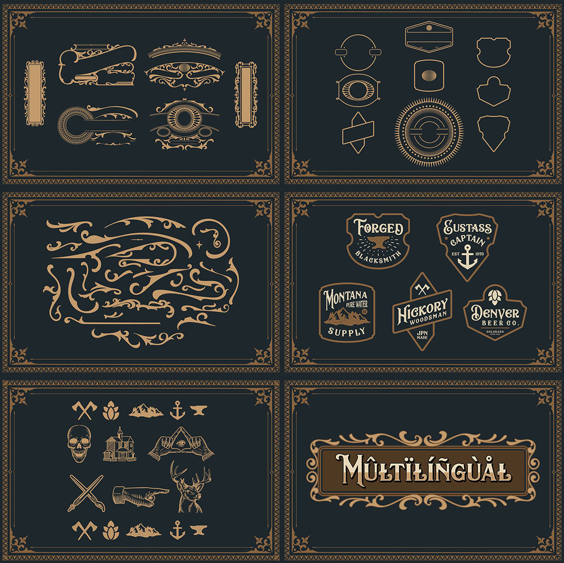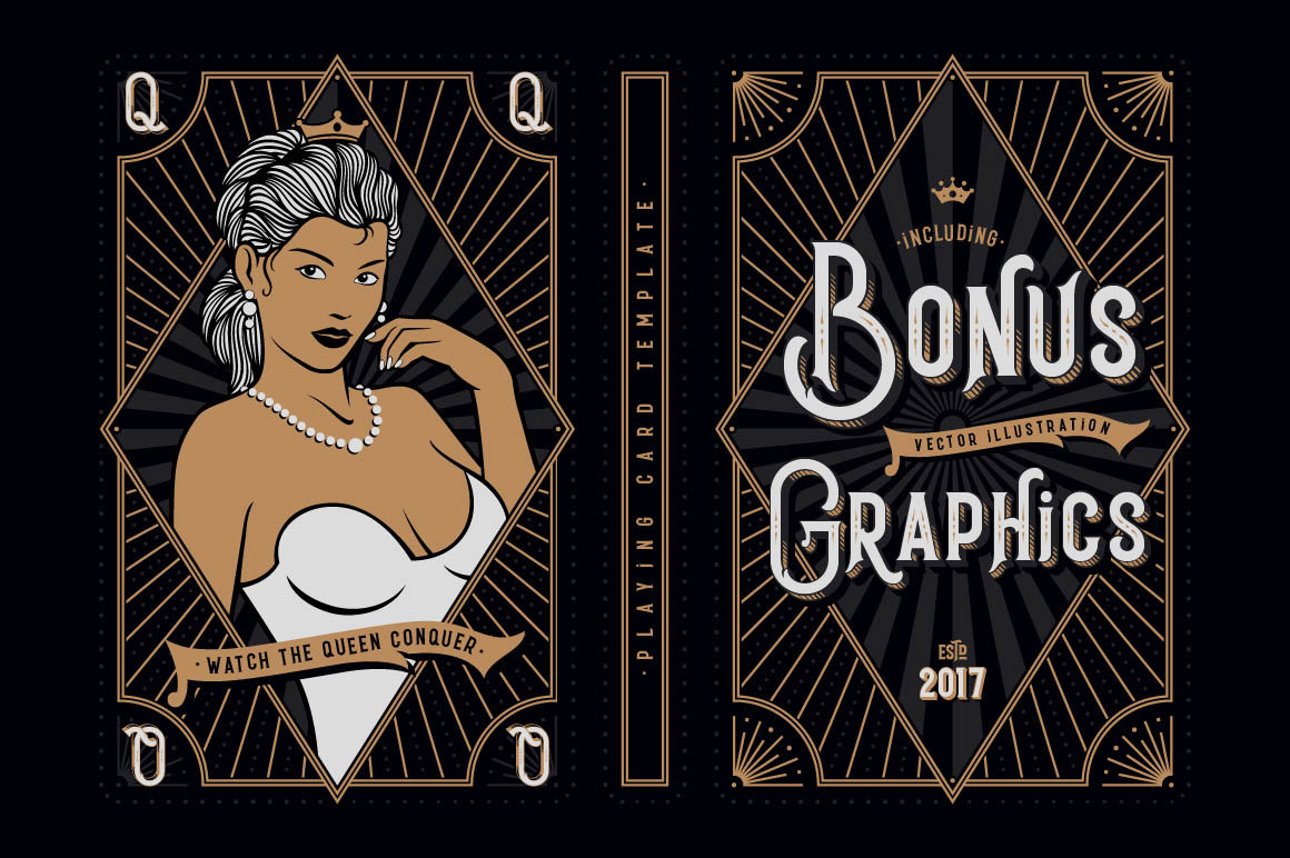 Hi! Presenting vintage style typeface “Black Queen”. It includes different font files for each decorative element, that can be useful for manipulating with colors and effects. Black Queen font has multilingual support and several laternative letter glyphs (all characters you can see on 4-6th screenshots). Also as a bonus you will get a vector illustration of a queen and a label template (3rd screenshot).