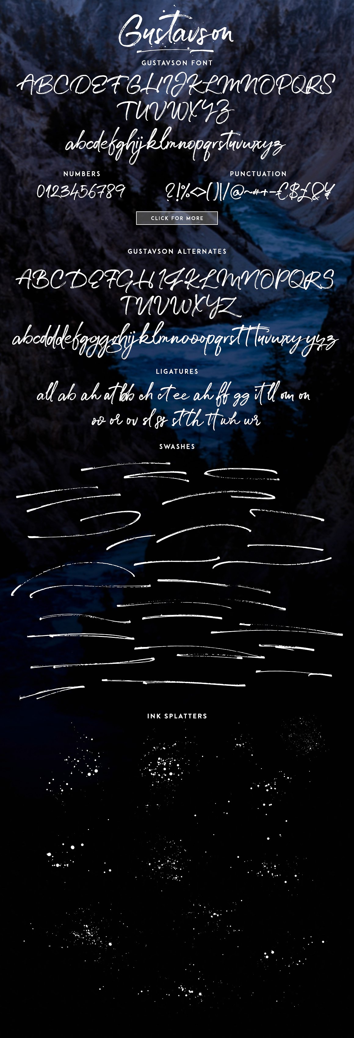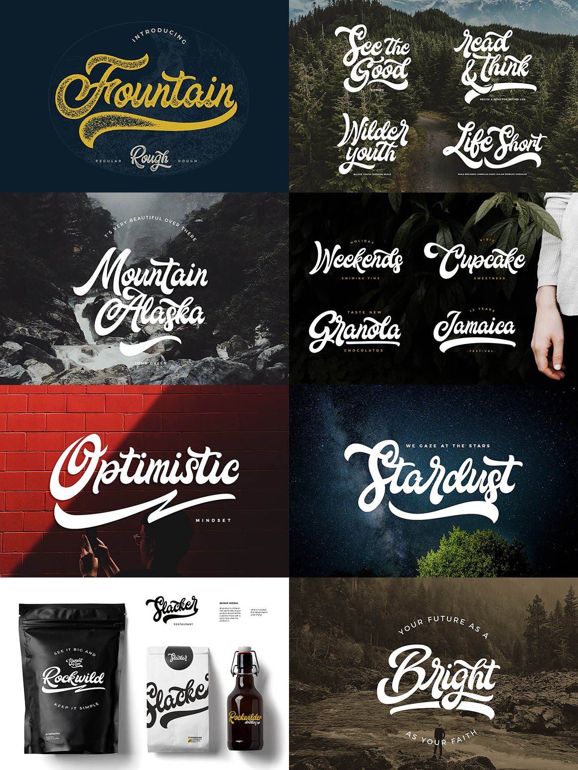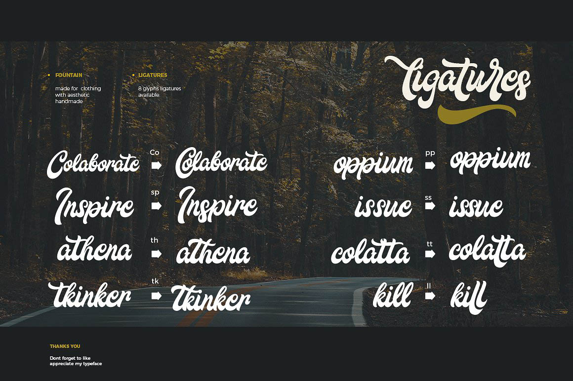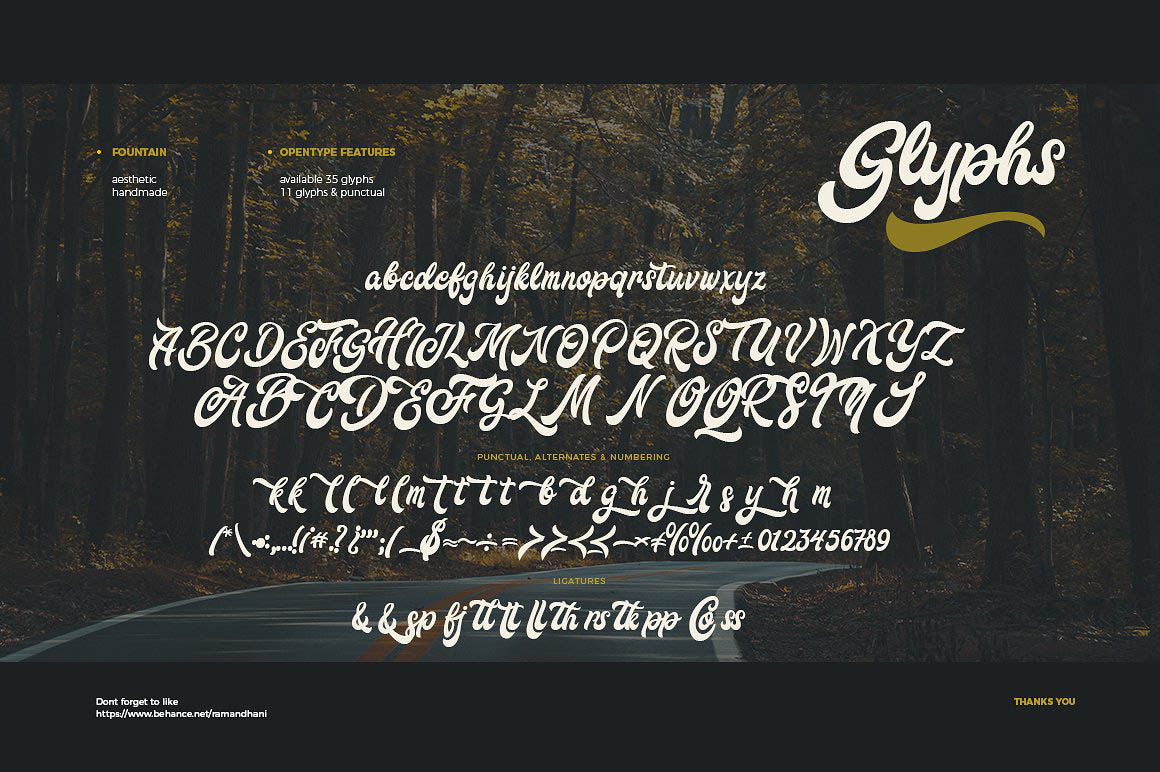 The Fountain Typeface is a script typeface come with aesthetic and bold character. You can use it as a logo, insignia, badge quote, packaging, headline, poster, t-shirt/apparel, greeting card, and wedding invitation etc. Every glyphs are ideal to make an attractive quote, design. The Alternate characters come with different shapes, could you help to create some creative designs for adventure, travel, wedding, or anything you want.