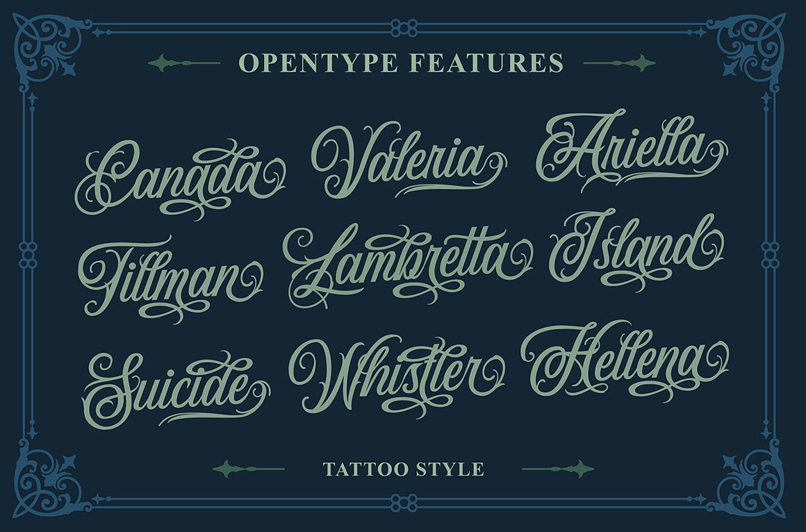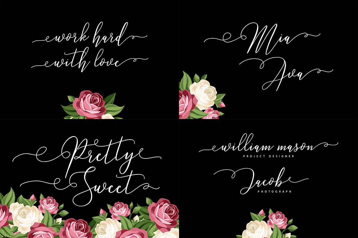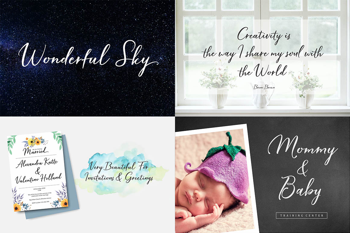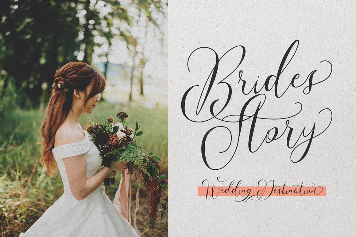 It is a signature font with a multitude of letter variations to make that perfect and unique design. This font is perfect for wedding invitation or your blog. Also with their help, you can create a logo or beautiful frame for your home. Or just use for your small business, book covers, stationery and more.