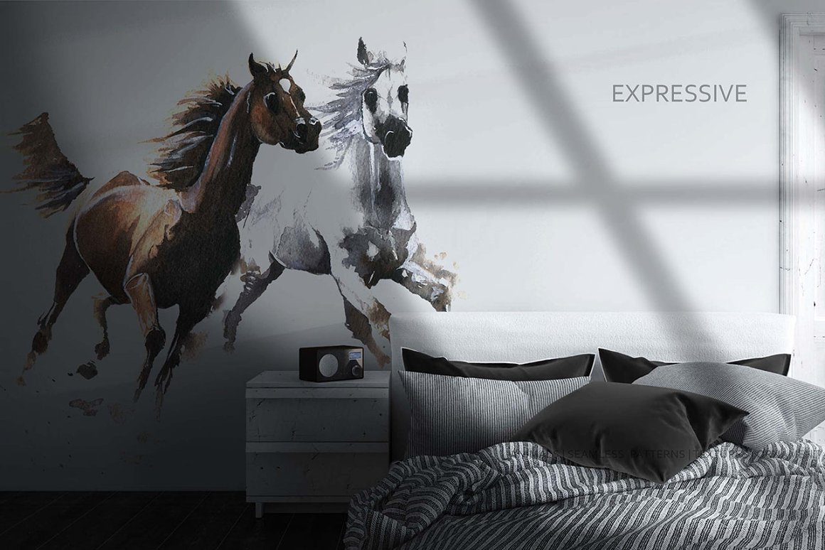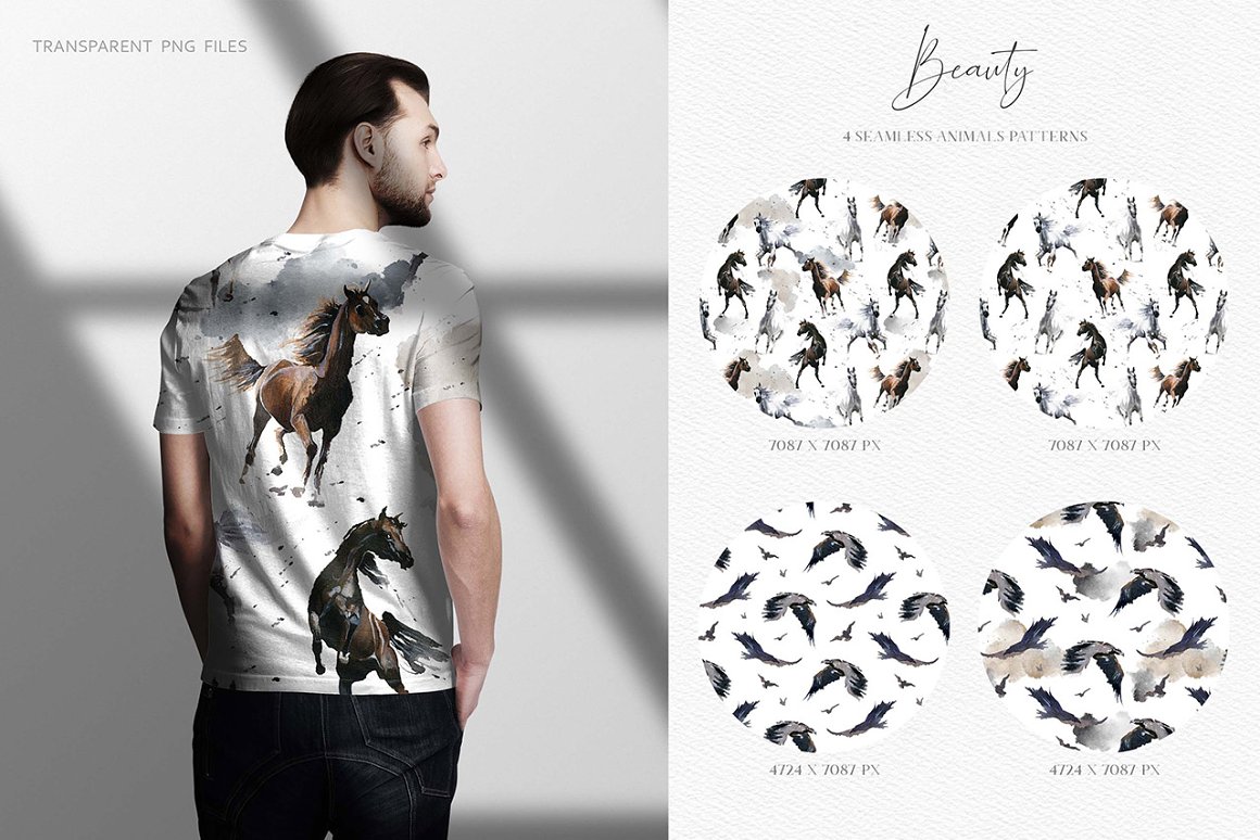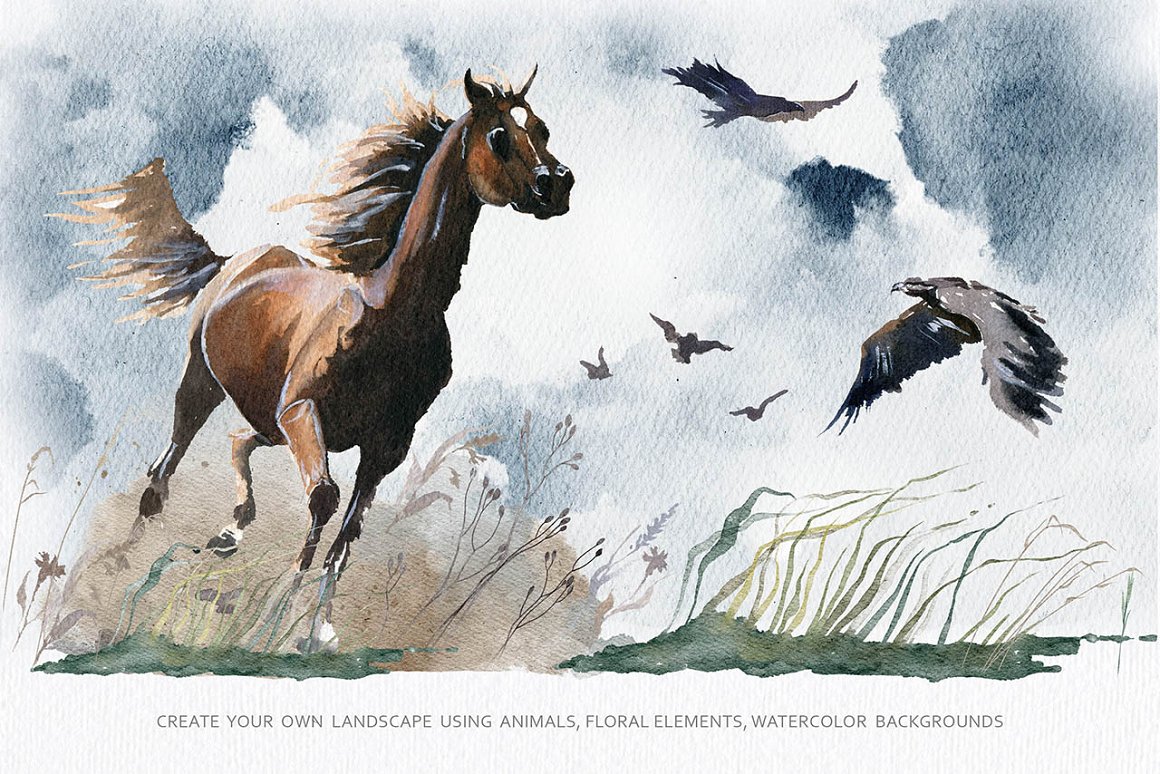 You will find beautiful wild horses, birds, plants and watercolor backgrounds which helps to create your own exclusive design. I also included some ornament elements and seamless patterns to make your project more creative. All the files are 300 dpi. The .PNG files have been entirely removed from its backgrounds.