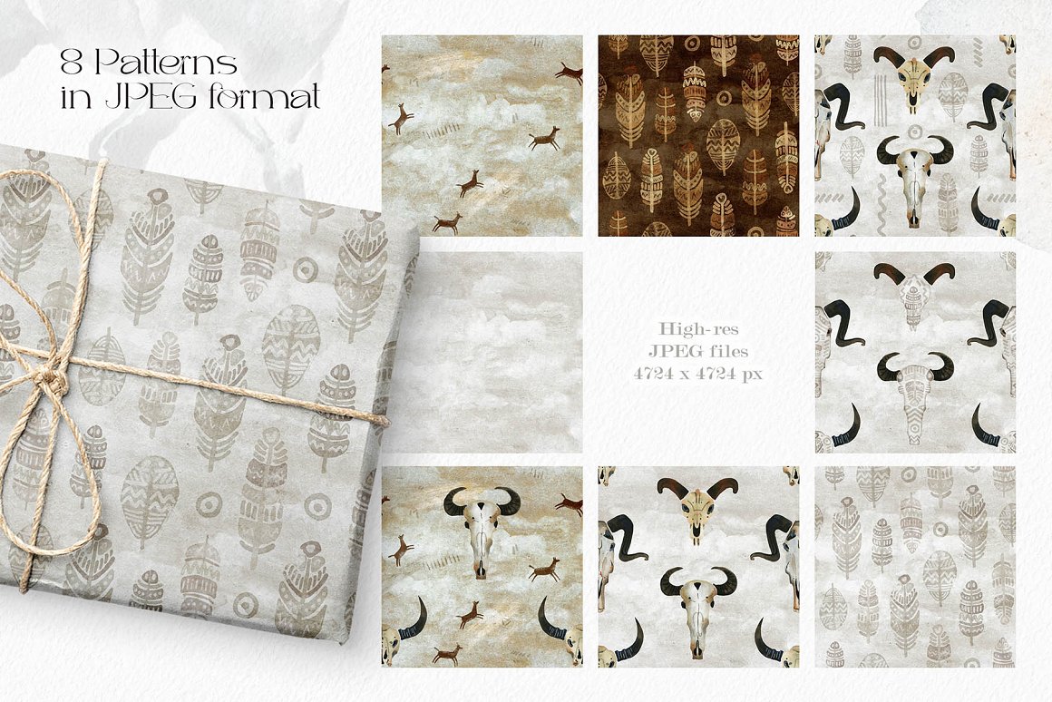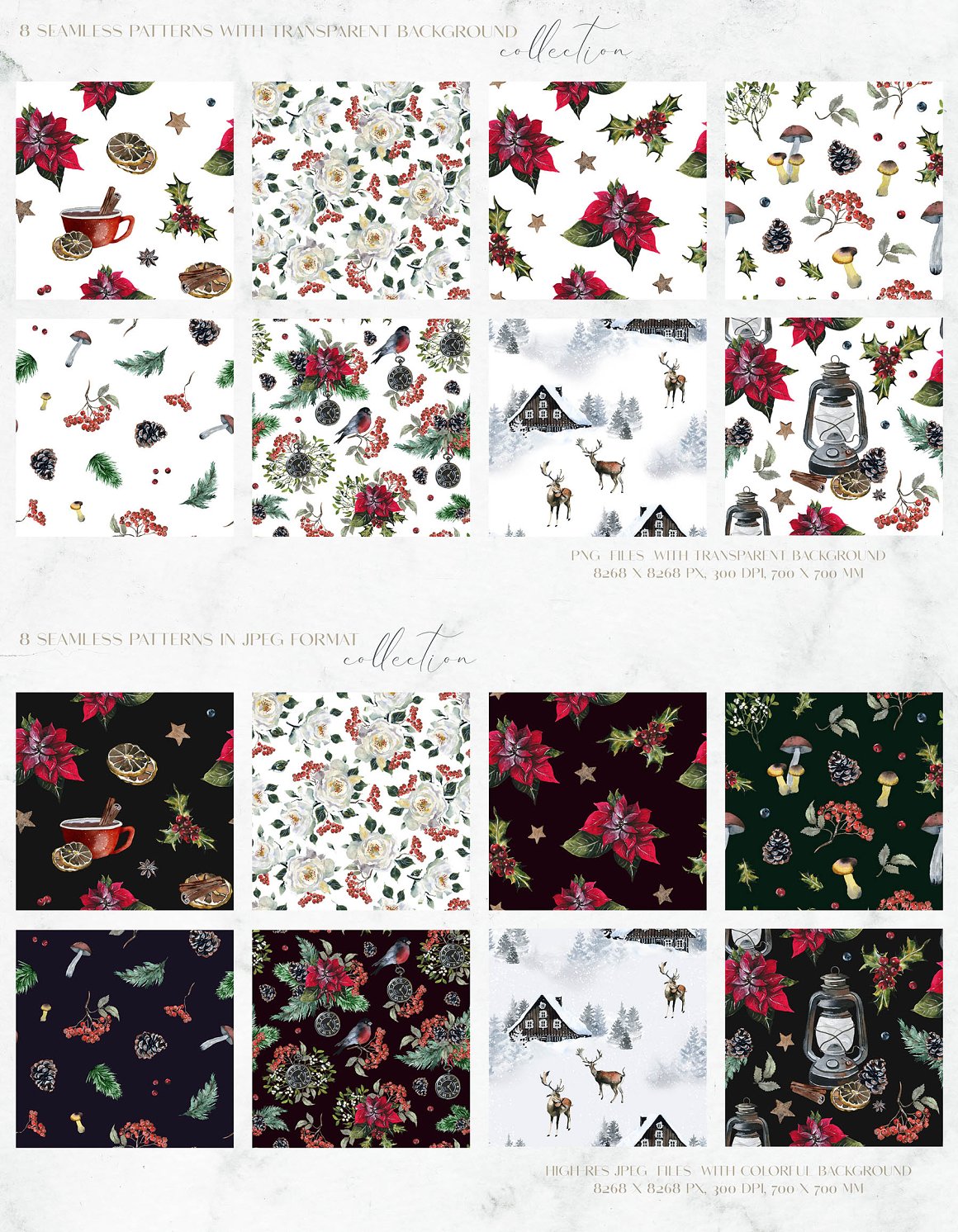 - Seamless patterns (8 PNG, 8 JPEG)