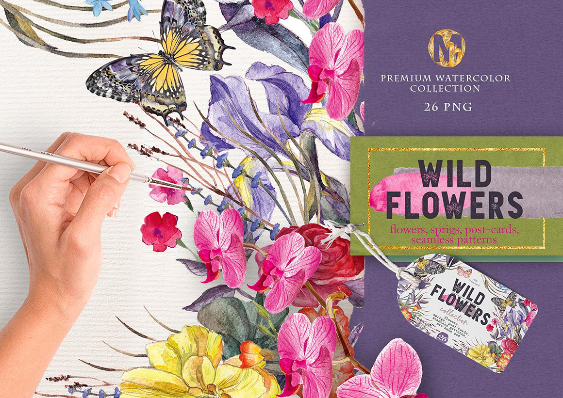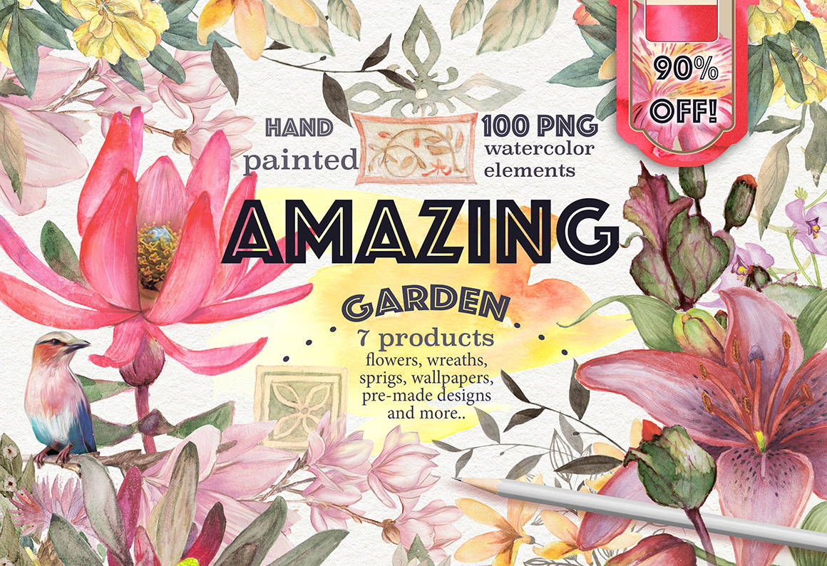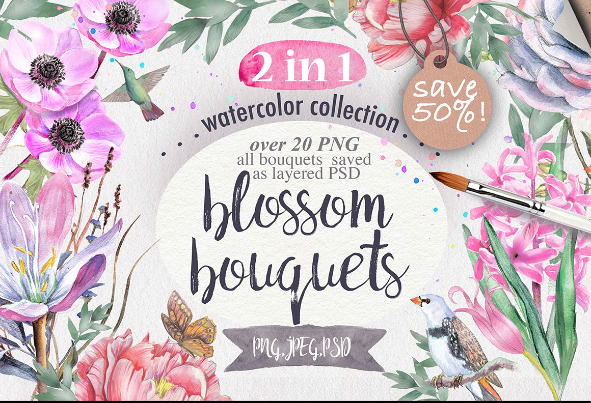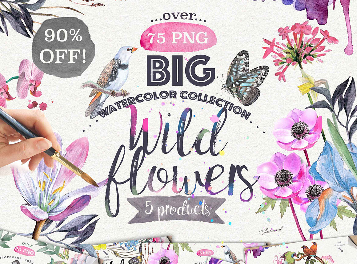 Need some romantic, floral, natural, decorative & wedding style watercolor illustration or graphic set for your new web or print project? Whatever the case, this beautiful watercolor illustration or artistic graphics bundle with lot of handdrawn illustrations, graphic elements, compositions & patterns is great source for all print or branding designers…. These graphics are in hi-res PNG or JPG image format so all are great for your new web design or any print design projects. Enjoy 😉