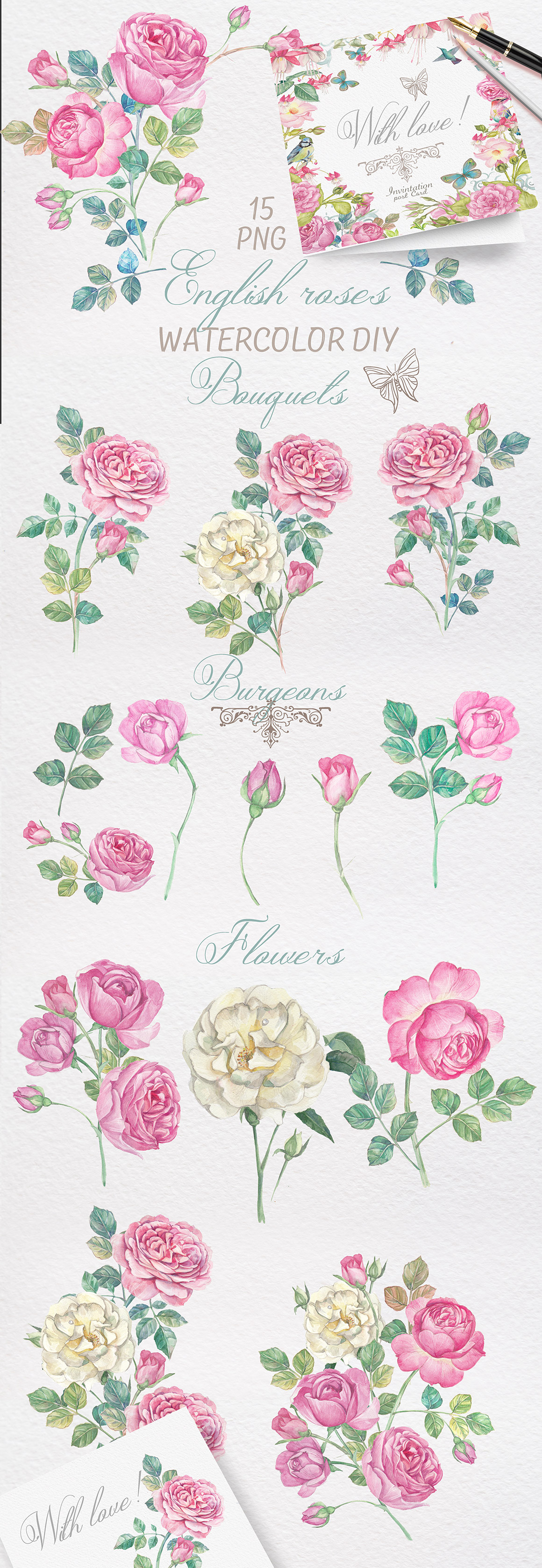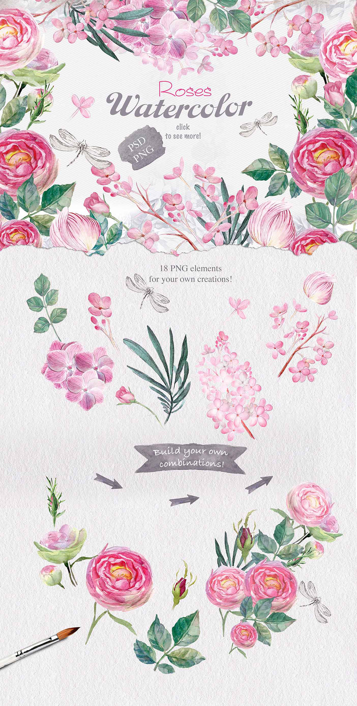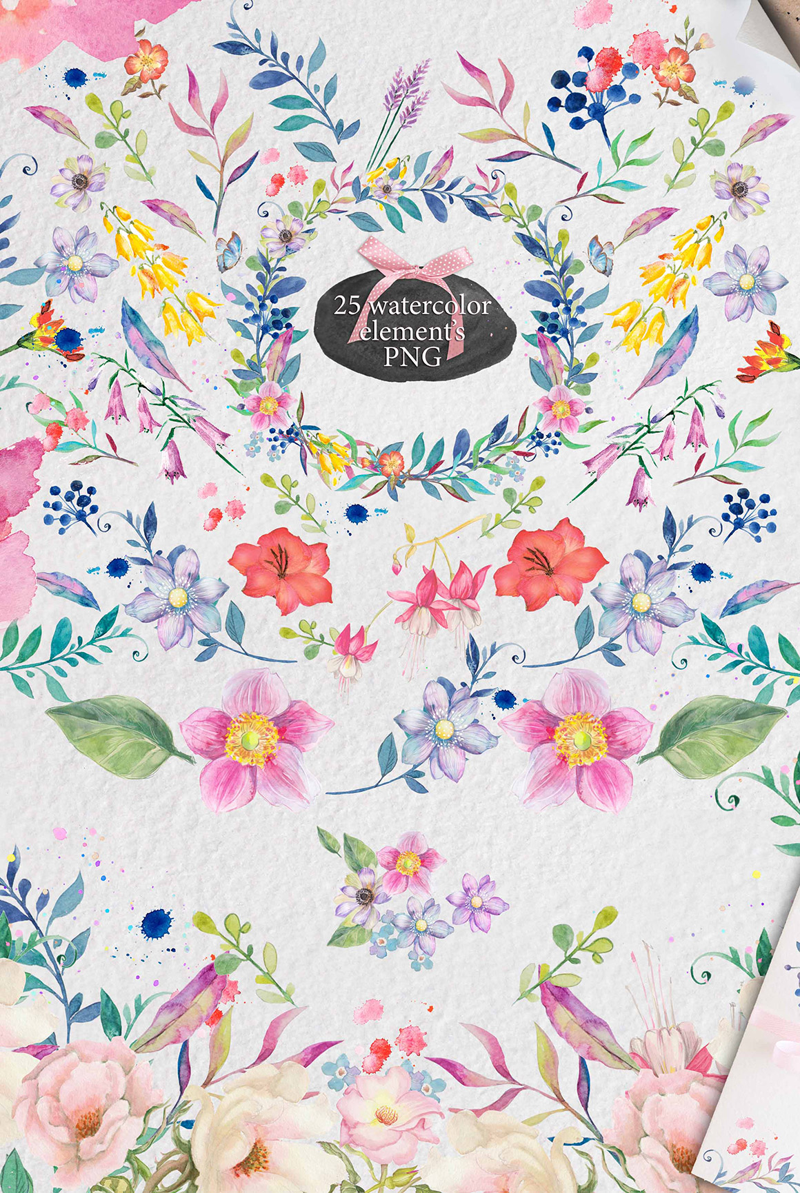 -15 PNG(300dpi) hand-drawn watercolor graphic elements, each element on an individual png with transparent background + 1 PNG bonus frame with roses and butterflies for greetings.