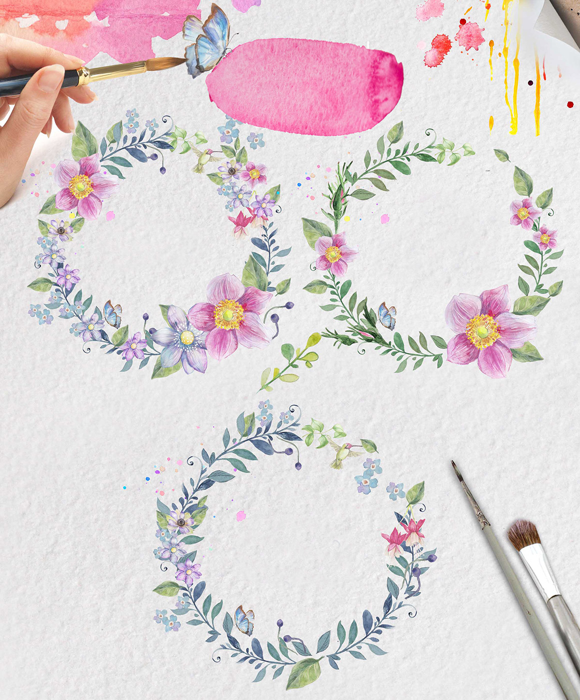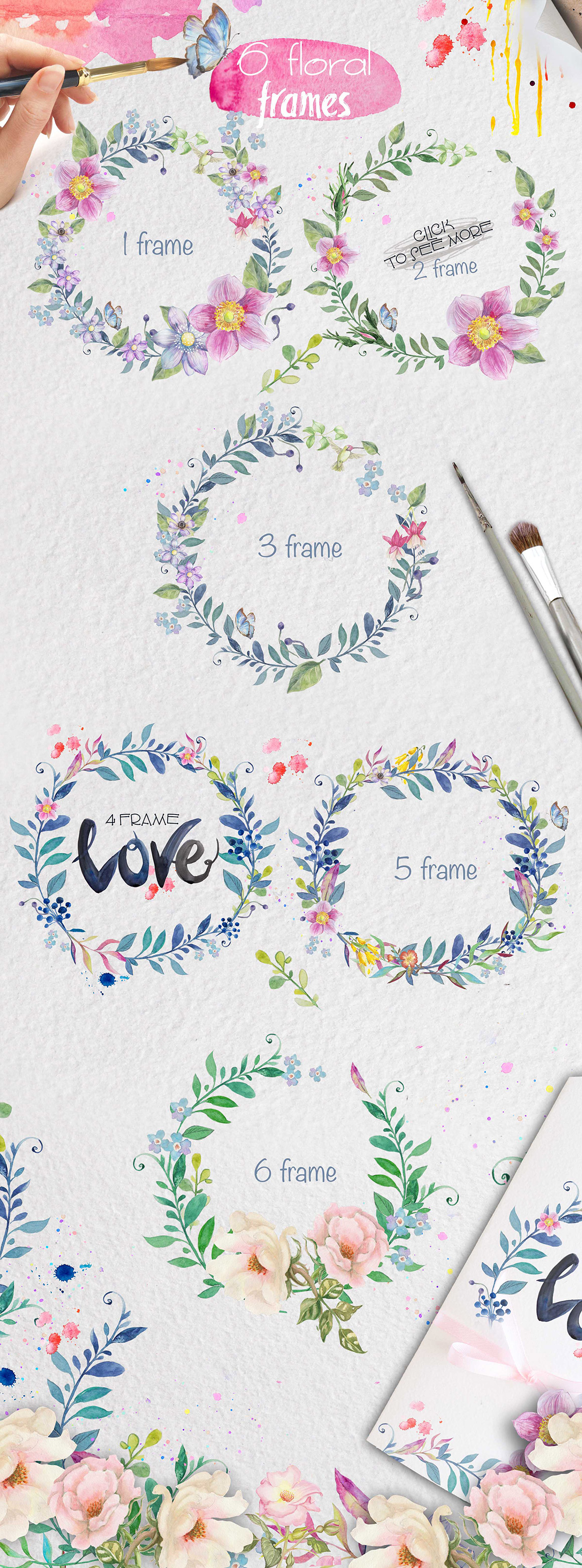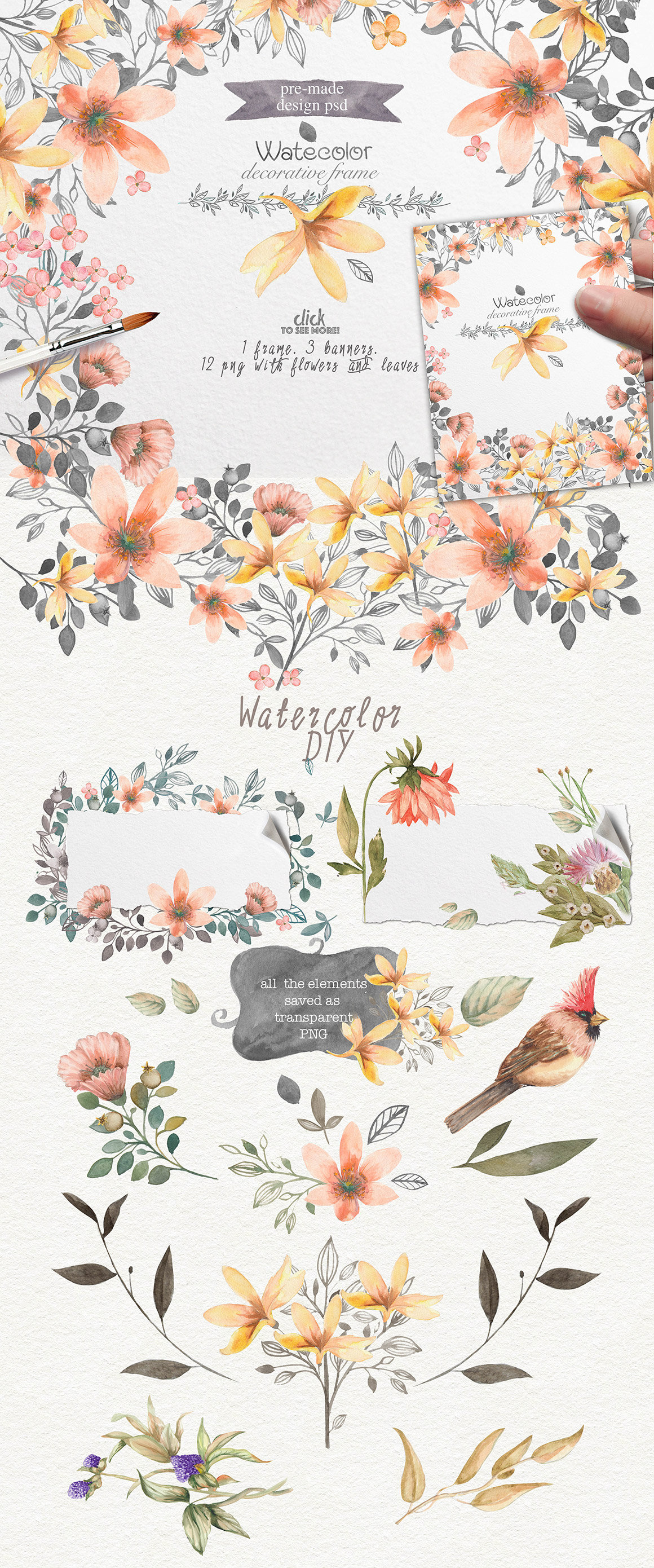 -15 PNG(300dpi) hand-drawn watercolor graphic elements, each element on an individual png with transparent background + 1 PNG bonus frame with roses and butterflies for greetings.
