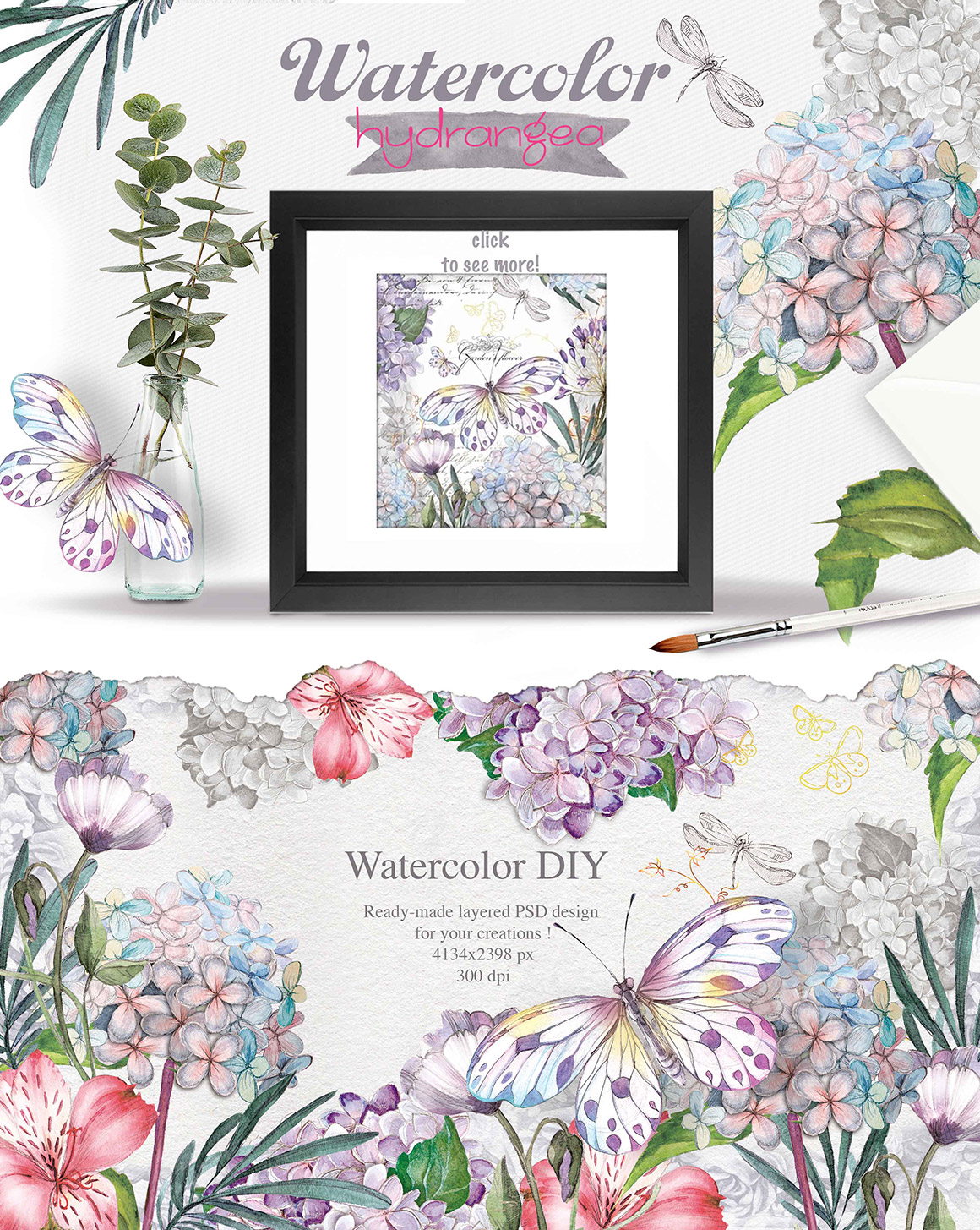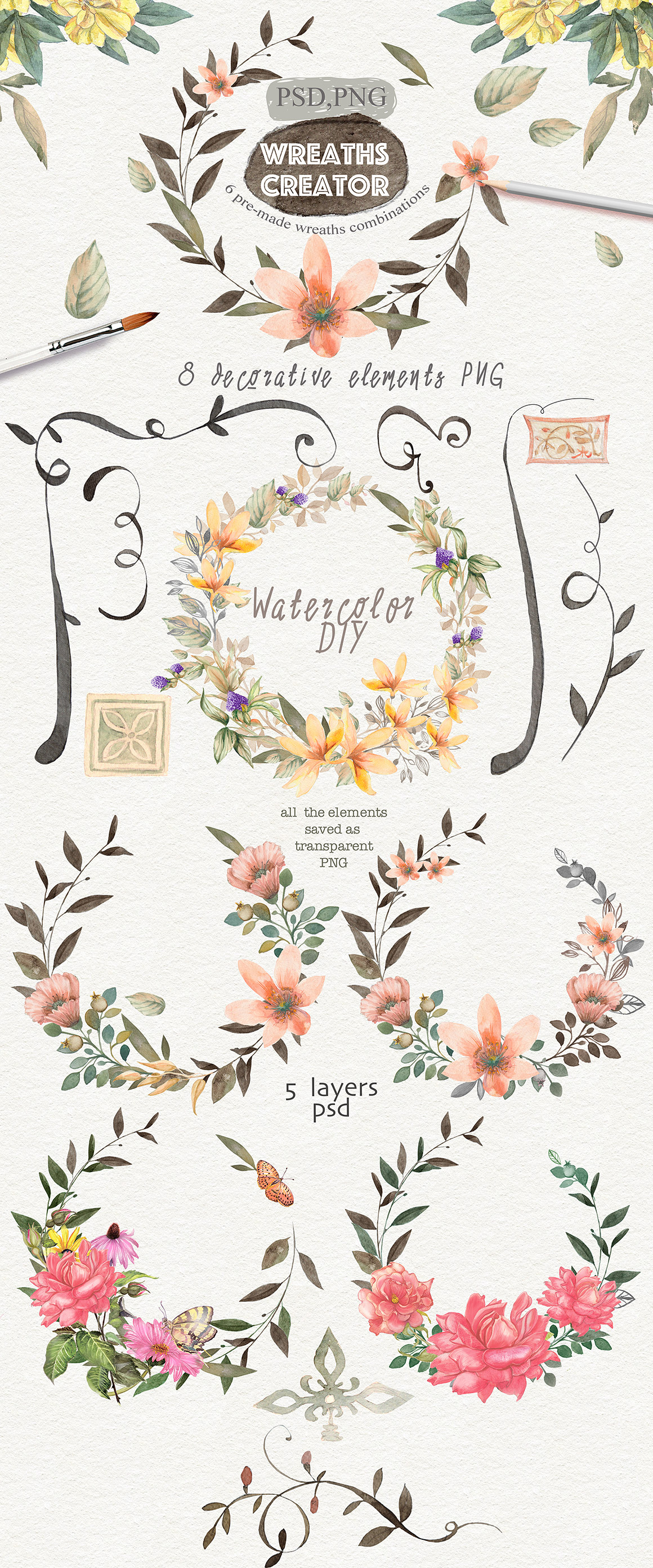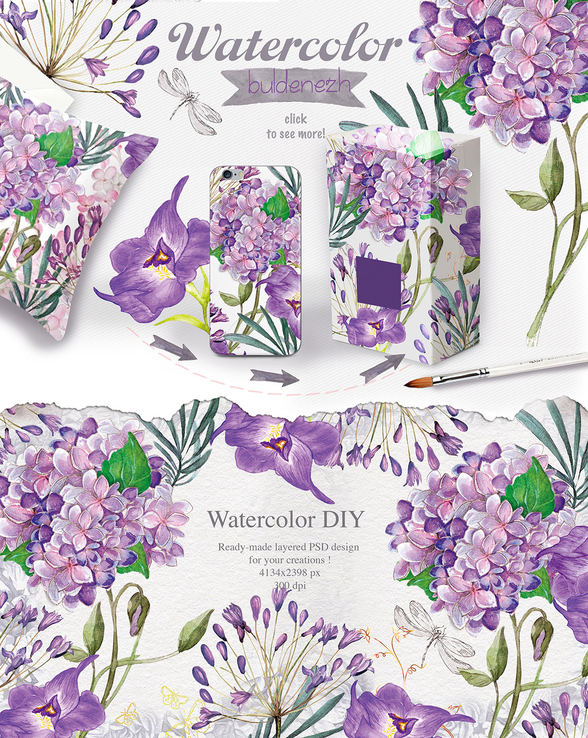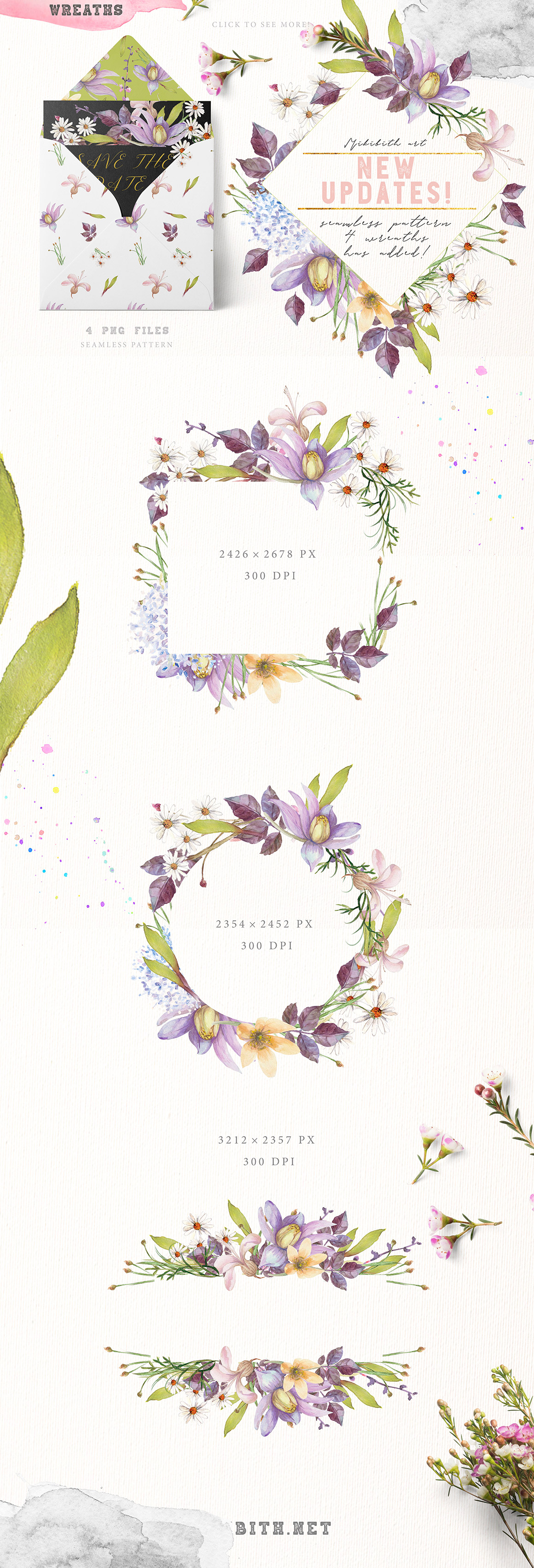I’m so glad to introduce to you this art collection !! There are more than 85 PNG and 7 Psd files with watercolor floral elements on the transparent PNG and layered PSD !